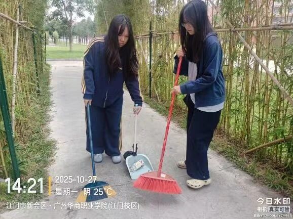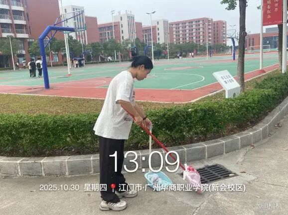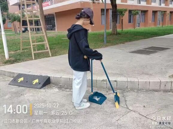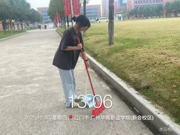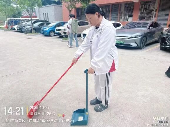第二组则投身于校园主干道及停车场的清扫,不仅扫除路面落叶与灰尘,还协助规范车辆停放秩序,让通行空间更显规整。