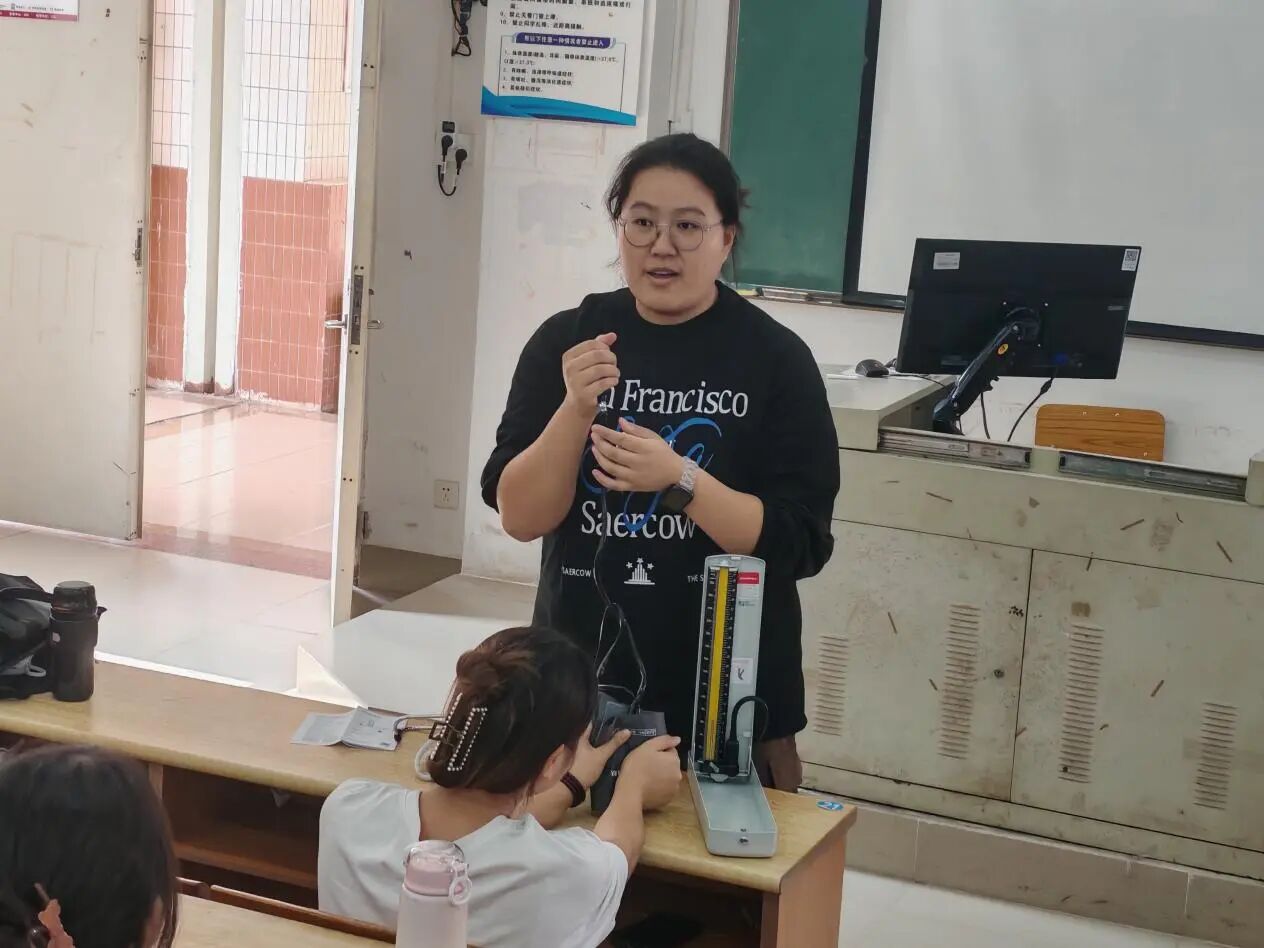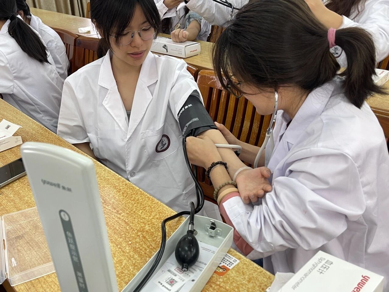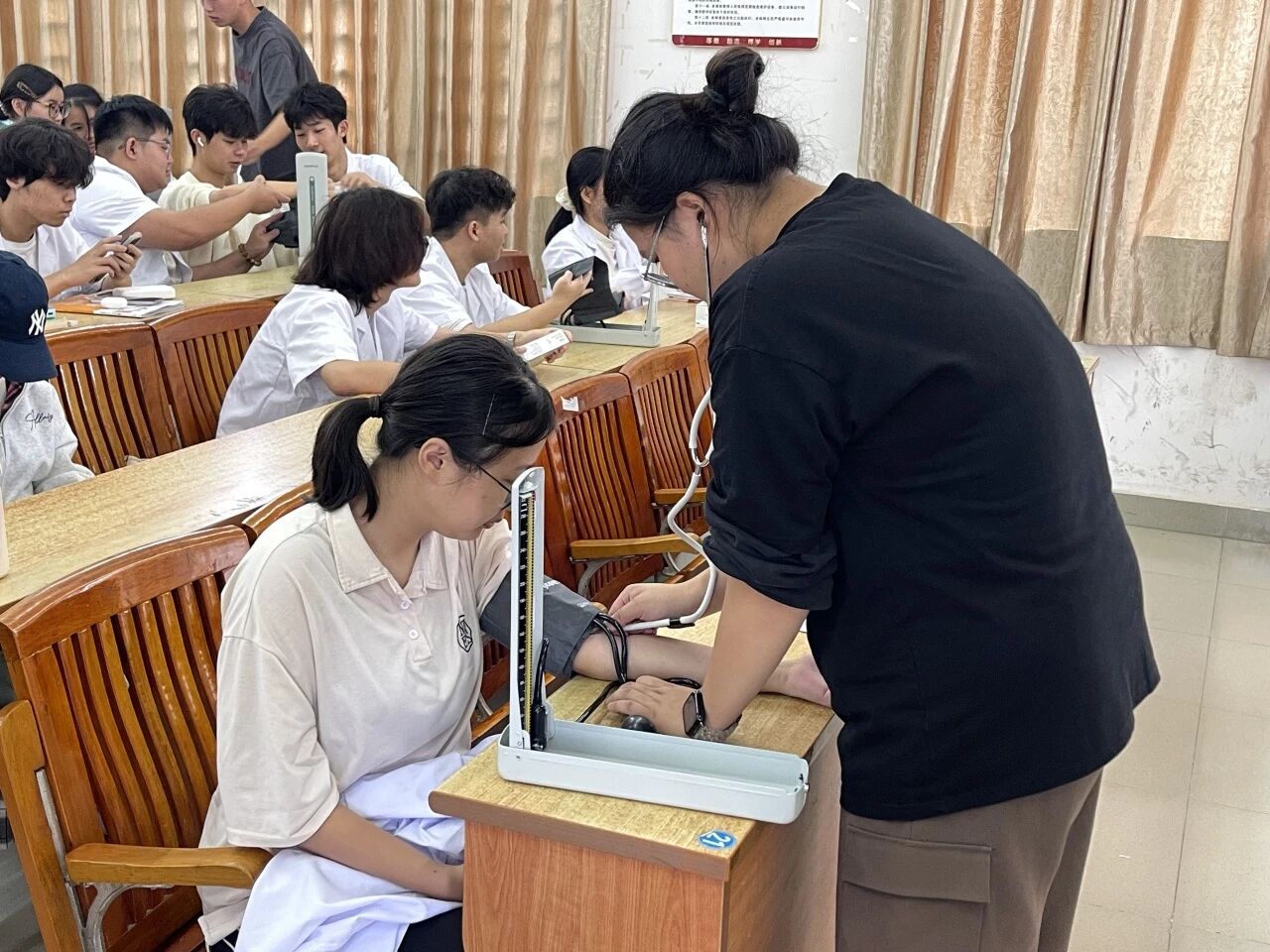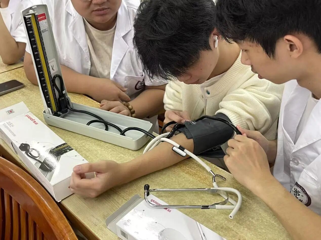 理论学习结束后,培训进入实践环节。在徐嘉欣老师的亲自示范和细致指导下,队员们分组进行了反复的模拟测量练习。从检查仪器是否完好、正确绑缚袖带,到准确使用听诊器、清晰判读读数并记录,每一个步骤都力求精准规范。通过手把手的教学与纠正,队员们成功地将理论知识与实际操作紧密结合,熟练掌握了血压测量的全过程。
