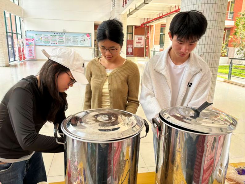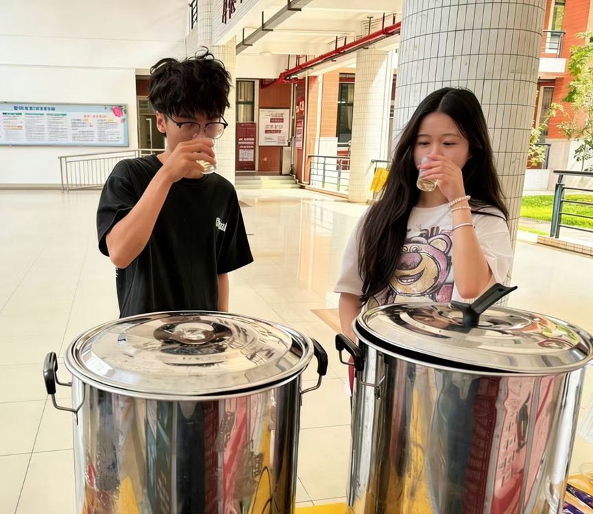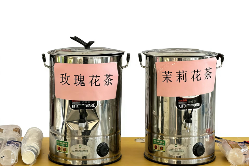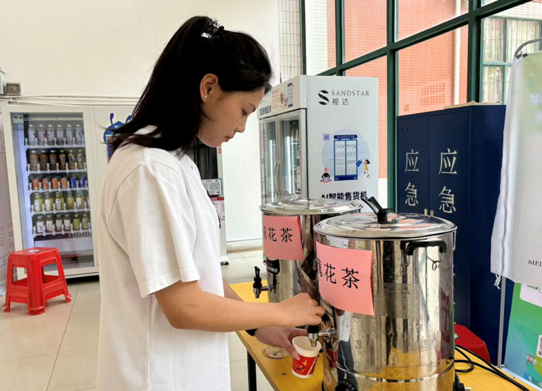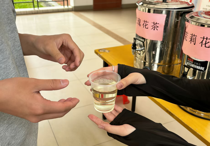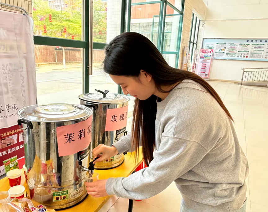 活动当天,志愿者们早早抵达现场,精心准备玫瑰花茶与茉莉花茶,以饱满的热情为同学们送上暖心茶饮。志愿服务中,大家细致讲解花茶养生功效:玫瑰花茶疏肝解郁、活血养颜,帮助舒缓学习压力;茉莉花茶理气开郁、提神醒脑,助力学子保持良好学习状态。