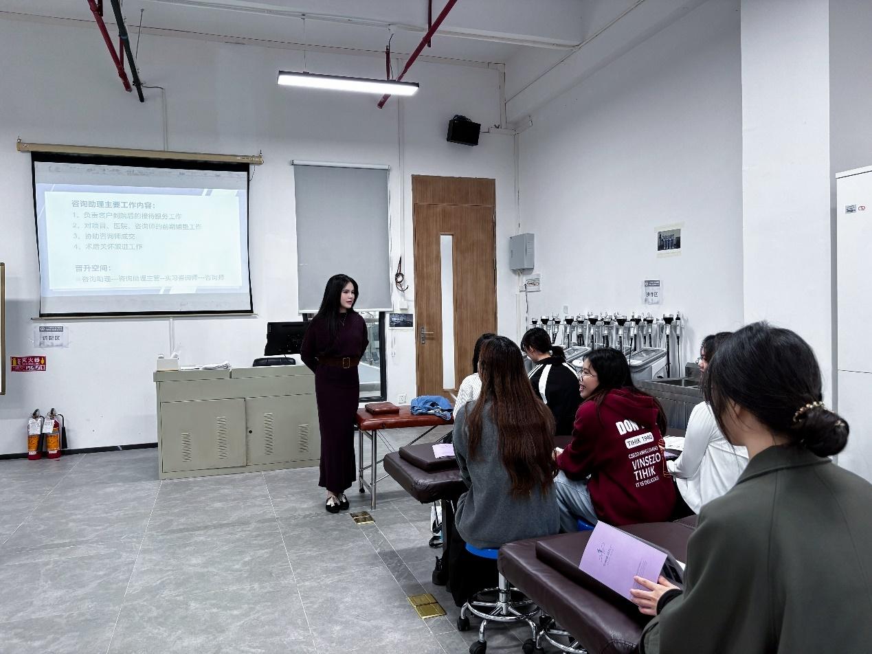 本次宣讲会特别邀请到该校2025届优秀毕业生、现任华俪惠喜市场部咨询师的陈美雪重返母校进行分享。她结合自身从校园到职场的转变历程,生动讲述了作为一名市场咨询师(美导)的日常工作,包括项目培训、活动传达、客户邀约等具体职责,并清晰梳理出“咨询顾问、区域总监、市场副总经理”的职业晋升路径。陈美雪的真诚分享,让在座同学对未来的岗位职责与成长空间有了更加具象的认知。