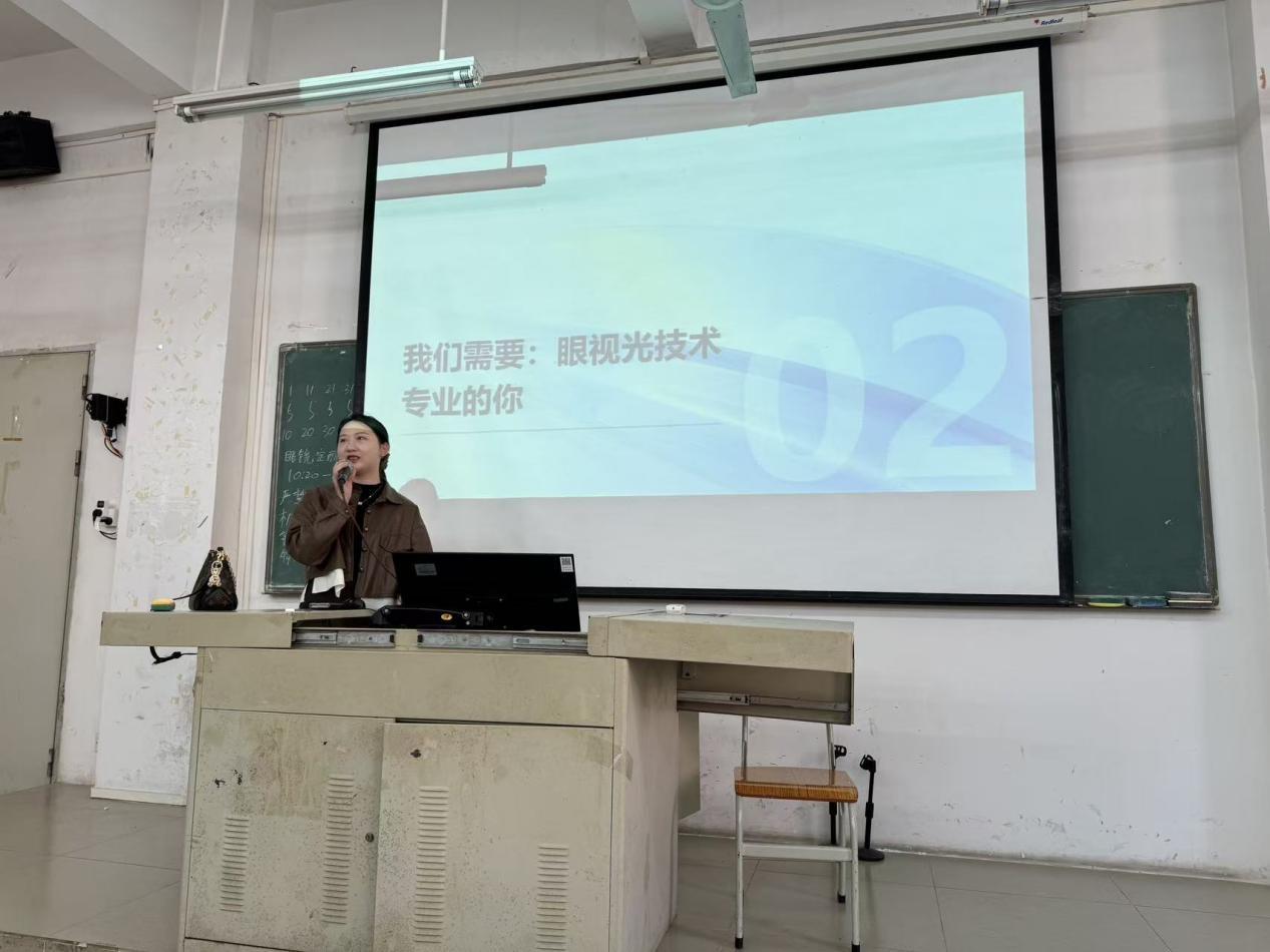 欧阳依云主任对康斯瑜经理一行的到来表示热烈欢迎,并介绍了我院在眼视光技术专业建设、产教融合模式创新及实习管理标准化等方面的成果。她指出,优质实习资源是提升人才培养质量的关键支撑,此次宣讲为学生搭建了直面企业的交流平台,既是对我院产教融合工作的有力推动,更是助力学生职业成长的重要举措,希望双方以此次活动为起点,探索更深度的合作模式。