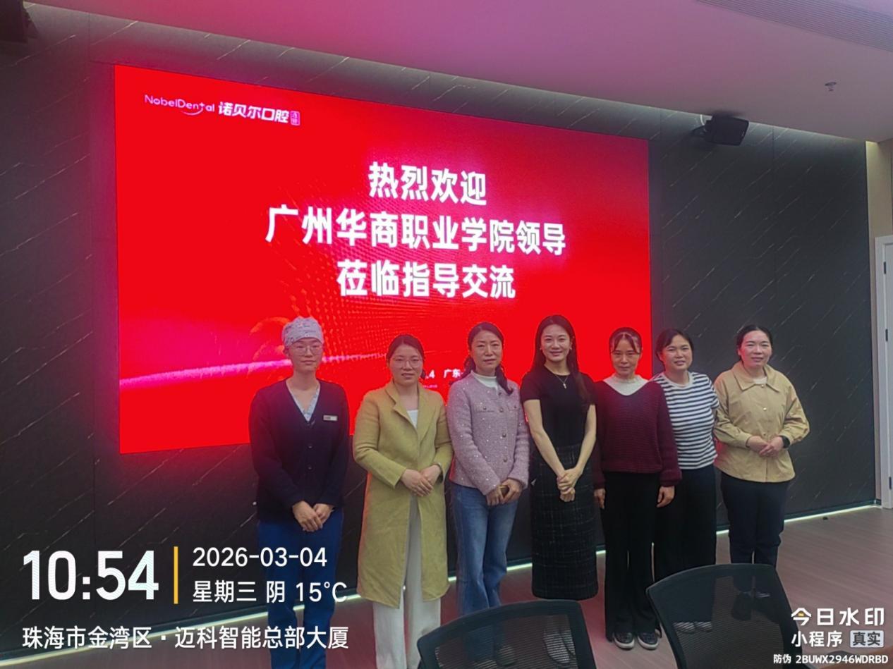 为深化产教融合,精准对接行业需求,推动口腔护理人才培养与就业市场高效衔接,2026年3月4日,我院院长屠美带队,护理教研室主任沈瑶及专业教师裴贤淑、曾田、叶琴一行五人赴珠三角地区开展访企拓岗专项行动。团队先后走访了广东省诺贝尔口腔医院、珠海市尤里卡口腔门诊部、珠海市柠溪口腔门诊部三家行业优质企业,围绕人才培养、微专业建设、实习就业合作等议题进行深入交流。