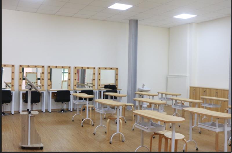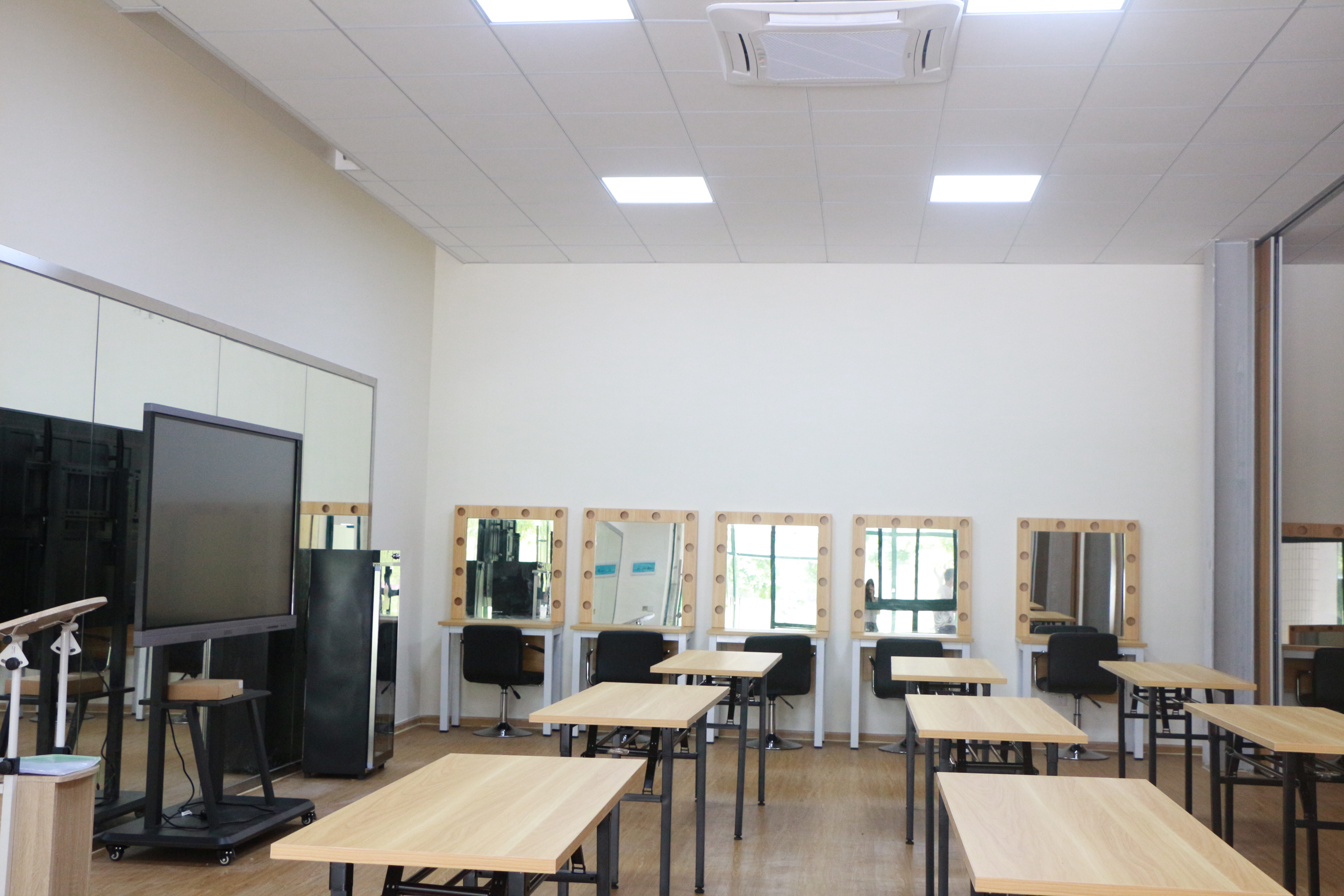 医美实训室包括美容技术实训室、化妆造型实训室两间,面积共52㎡,工位60人,承担着医学美容技术实训课程。医美实训室主要仪器设备包括美甲台、化妆凳、舞蹈镜、平推木质趟门、化妆镜、上墙桌、可移动式黑板、投影机、摄影补光灯、电脑、摄像机、吊柜、可折叠长方形桌子等。