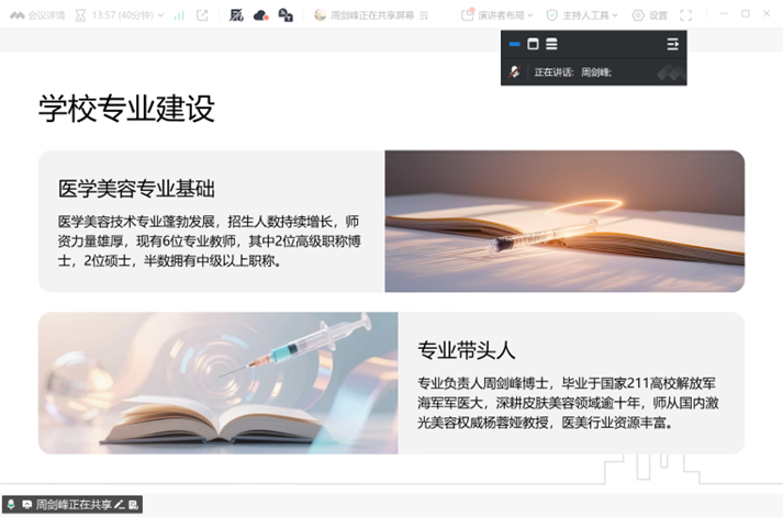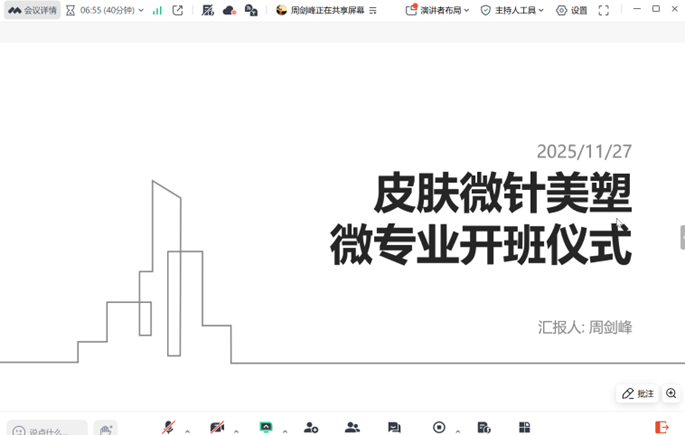 近日,医学技术学院医学美容技术教研室成功举办首届皮肤微针美塑微专业线上开班仪式。仪式通过线上会议平台举行,由教研室专任教师王瑞瑞主持。医学美容技术教研室主任周剑峰、微专业教学团队全体教师以及首批录取的52名2023级护理专业学生共同参与,标志着这一面向未来、注重跨学科融合的人才培养项目正式启动。