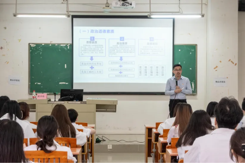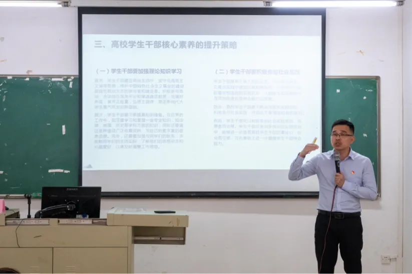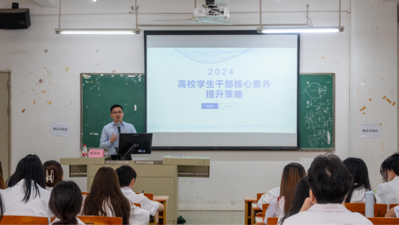 本次培训的主题为“高校学生干部核心素养提升策略”,由学院党总支副书记黄泽栋主讲。黄书记从政治道德素养、知识素养、能力素养和心理素养四个维度出发,通过丰富生动的案例,为在座的学生干部们呈现了一堂内容丰富、思想深刻的课程。他激励学生干部们要不断提高自己的思想境界,端正工作作风,保持良好的心理状态,并致力于自我完善和沟通创新。