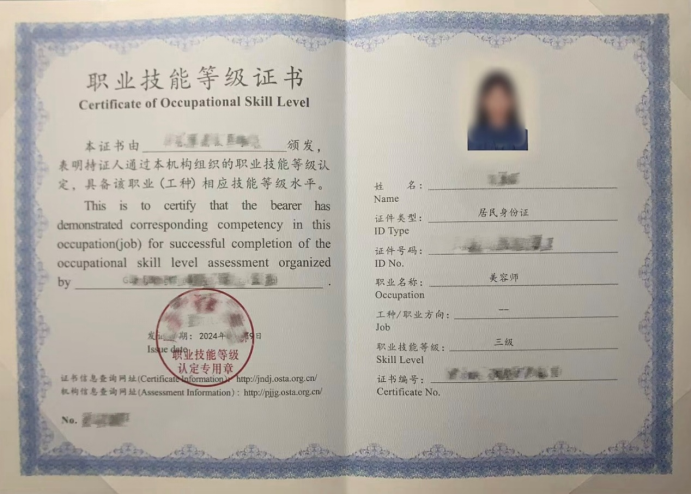 美容师(三级)证书是由国家人力资源和社会保障部认可的职业资格证书,属于美容师职业资格体系中的高级工级别。这一资格认证需通过国家职业资格考核,证明持证者具备美容领域的专业知识和技能,能够从事皮肤护理、美容服务、仪器操作、培训指导等相关工作。