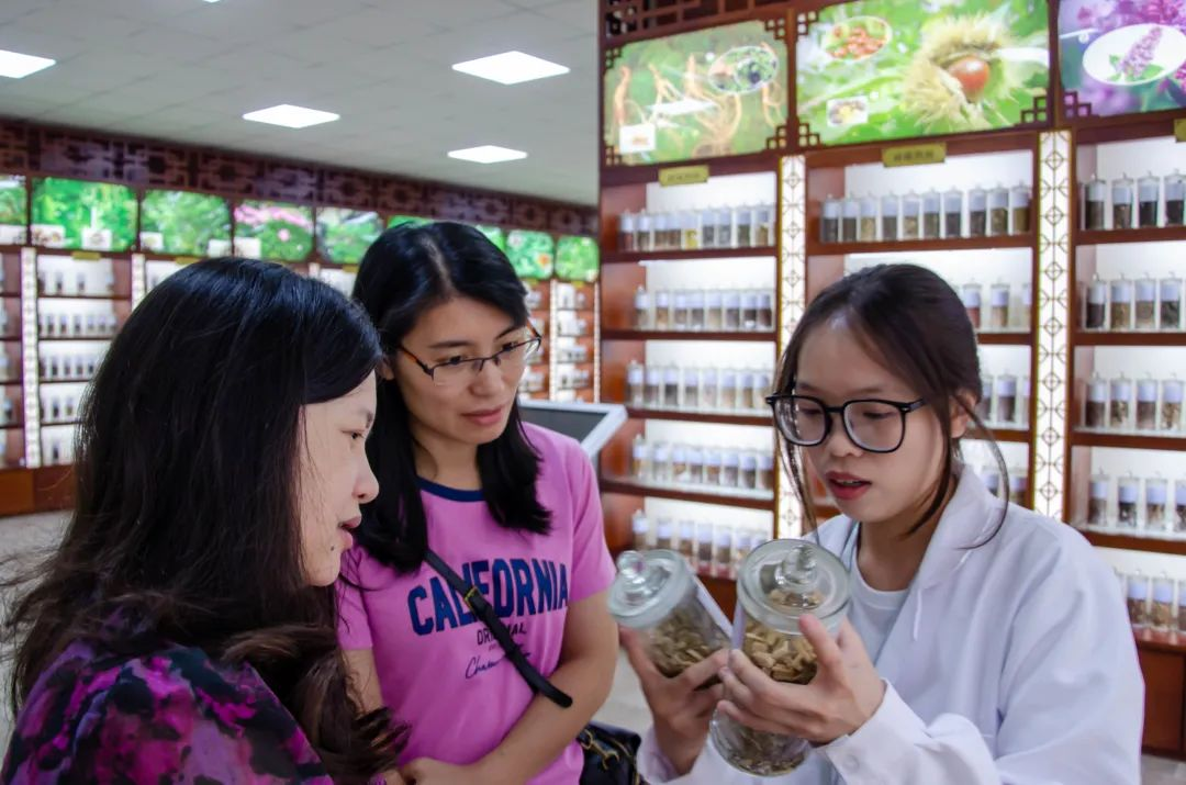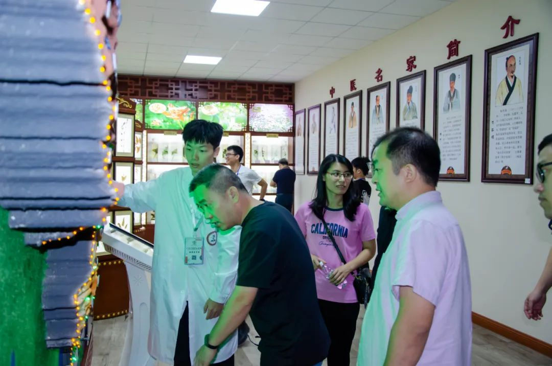 健康医学院杨滔老师带领讲解队为领导与嘉宾详细讲解了标本馆各展区和中草药分布沙盘。