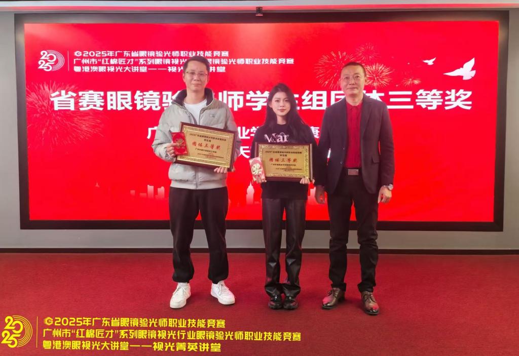 2025年12月26日,由广东省眼镜行业协会、广州开放大学与广州市新概念眼镜视光职业培训学校联合主办的2025年广东省及广州市眼镜视光行业职业技能竞赛圆满落幕。我院眼视光技术专业学生谢华普、丁炜轩、罗晓玲、周远霞积极参与、表现出色,在多项评比中斩获荣誉,展现了扎实的专业技能与良好的职业素养。