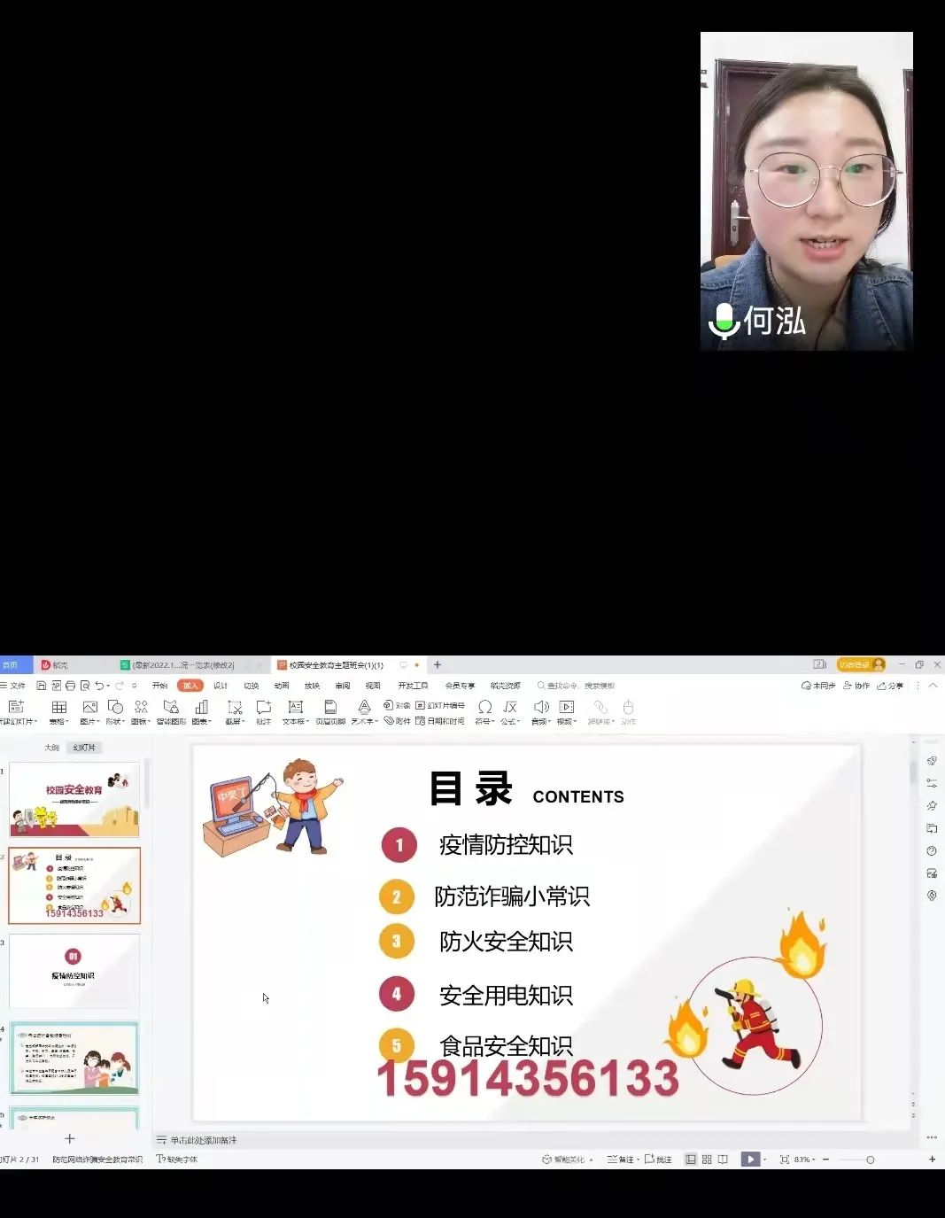 为了营造同学们健康成长的良好环境,进一步了解疫情防控、防诈知识,健康医学院21级中药学2班于2022年3月1日晚上20:30在腾讯会议召开了以“校园安全教育”为主题的班会,出席本次班会的有辅导员何泓老师,班主任庄泽森老师以及21中药学2班全体同学。