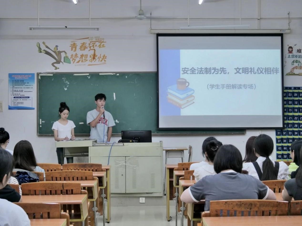 本次班会上班助师兄师姐们向新生介绍了学校的规章制度,并强调了宿舍安全、出行安全以及学生日常行为规范等注意事项。除此之外,还开展了一系列关于反诈骗、助学金和奖学金知识的普及活动。