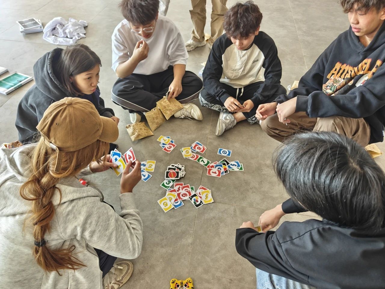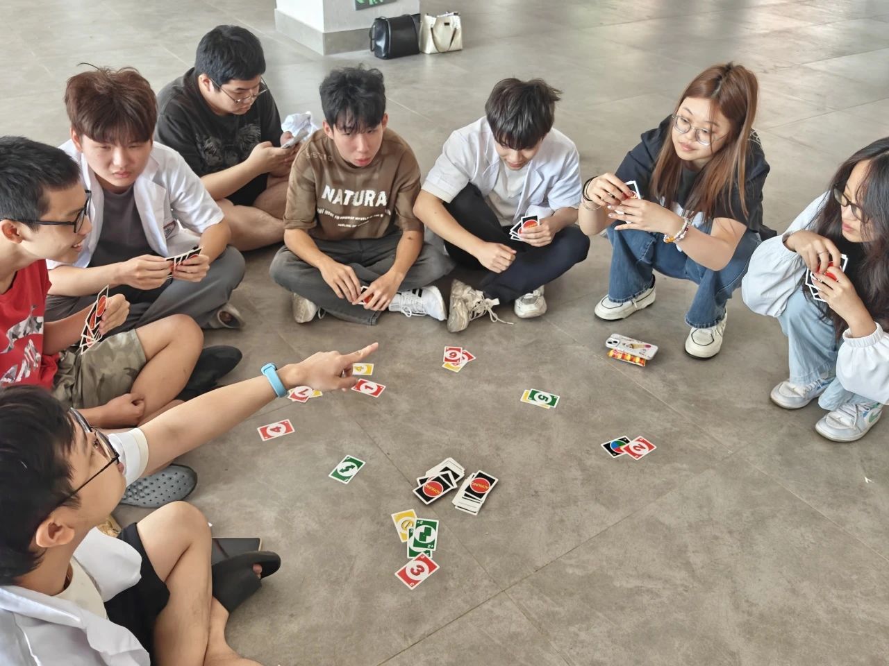 UNO游戏的战场上,智慧与协作的火花四溅。大家迅速组队,五支七人队伍和一支八人队伍如六股奔腾的洪流。每组选派的精英选手们目光坚定,出牌间尽显策略。每一轮牌局的胜负都关乎团队的荣誉,紧张的氛围如弦上之箭。当第一张胜利的卡牌落下,欢呼声如雷鸣般响起,胜利队伍成员手中的小零食成为了甜蜜的果实,是团队智慧与协作的最好见证。