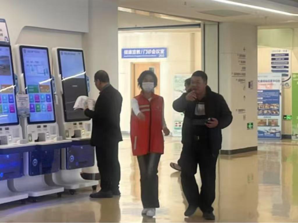 清晨八点,门诊大厅尚显空旷,身着鲜艳红色马甲的志愿者们已早早抵达。在医院工作人员的悉心指导下,他们迅速进入工作状态,分工明晰、协同配合。在医技楼等关键区域,志愿者们穿梭其中,耐心引导患者进行挂号缴费,帮助他们打印检查报告,解决就诊过程中的“技术难题”;在候诊区,志愿者们主动上前,用亲切的话语解答患者对就诊流程的各种疑问,不仅帮助患者理清就医步骤,更有效缓解了他们候诊时的紧张心理。