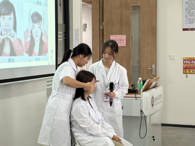 陈锦莹部长采用理论和实操二者结合的方式,让队员们快速掌握面部推拿的技能。在识别穴位环节,她随机挑选队员上台,检验大家对鱼腰、迎香、人中、承浆等穴位的认识程度,帮助大家精准定位穴位。