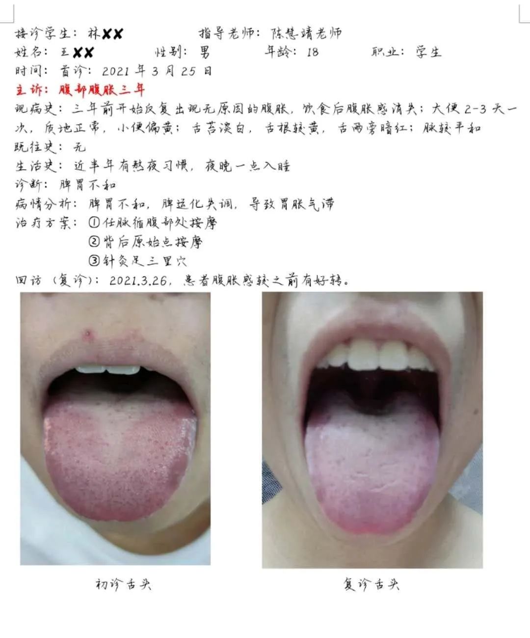 在往期的义诊活动中,义诊服务人员一直有跟踪病人治疗后的状况,从反馈中得出,病情有明显好转,下面挑选了两份病案对比治疗前和治疗后的图片。