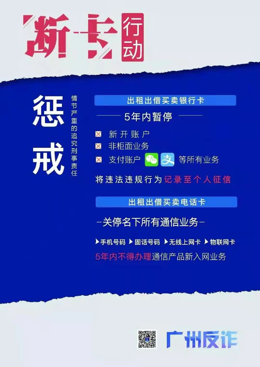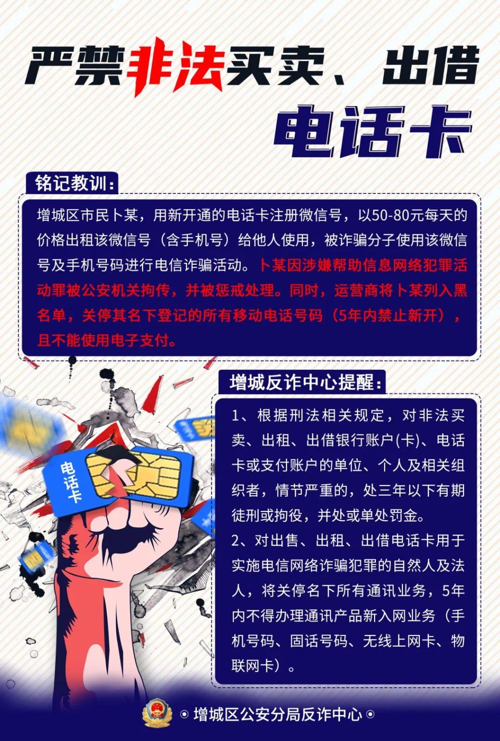2、对出售、出租、出借电话卡用于实施电信网络诈骗犯罪的自然人及法人,将关停名下所有通讯业务,5年内不得办理通讯产品新入网业务(手机号码、固话号码、无线上网卡、物联网卡)。