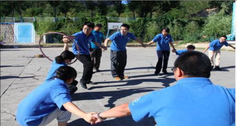 (2)所有成员手拉手围成一圈,用呼啦圈穿过所有人的身体回到原位。在活动过程中,不能以语言为沟通工具,只能依靠肢体语言和眼神进行沟通,相互拉着的手不能放开,也不能用手指去勾呼啦圈,各单位同时进行。