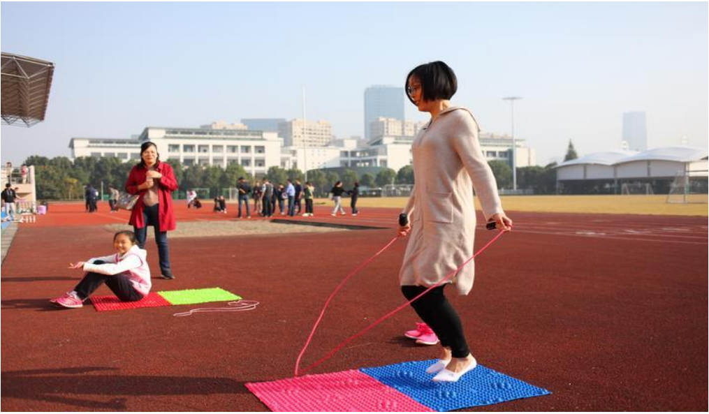 各单位限定报名人数为 10 人,男女各 5 人,不能穿鞋,在指压板上 1 分钟连续跳绳 30 次为达标,得 1 分(中断重新归零计数)。