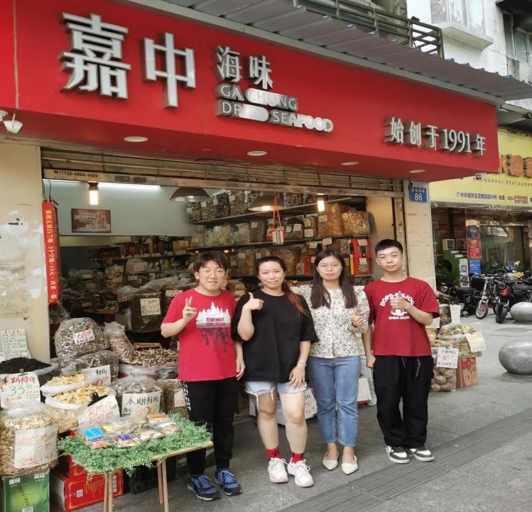 20中医养生保健1班彭业进: “我在这里实习已经有半个月了,店里经常有很多顾客来买汤料。他们大多是附近的街坊,其中也不乏有来广州旅游的游客。平时我们的工作就是负责海味干货和药材的称重和销售,一有顾客进来我们会先咨询他们的购物需求,然后根据他们的需要进行称重售卖,还会指导他们怎样处理这些食材进行煲汤,或者告诉他们还可以再放哪些食材进行搭配,以达到更好的食疗效果。如果他们买的是党参和五指毛桃之类的坚硬药材,店里还有专门的药材闸刀,人工把药材切成小段; 如果顾客有打粉的需求,我们也会收取一定的加工费,帮顾客把药材研磨成细粉。我们店里采取的是线上网店和线下实体店相结合的模式,网店上主要卖的是汤包茶包,老板娘在网店上接到订单以后,会把订单发到我们的工作群,然后我们就会根据指示去找到相应的药方去称量药材,打标签,打汤包。