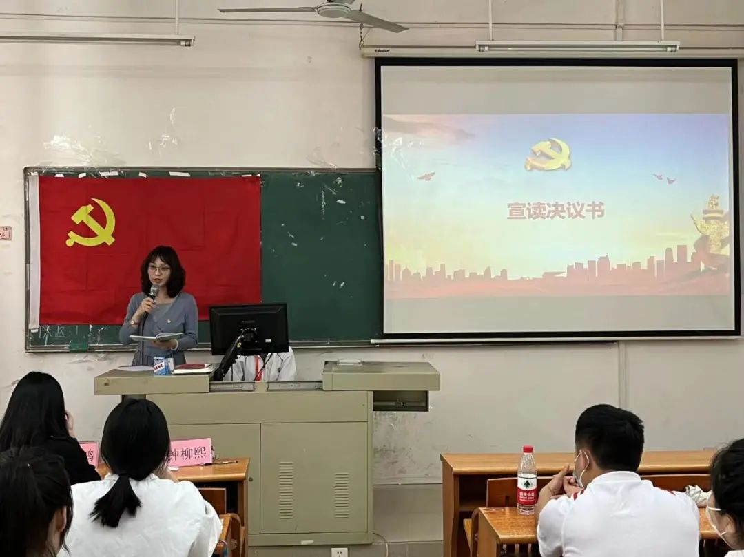 大会第四项议程:学生第二党支部组织委员钟柳熙老师向大会宣读决议书,本次大会发出选票5张,实际收回选票5张,实际有效票数5张,与会党员一致通过接收韦柏欣等7位预备党员如期转正。