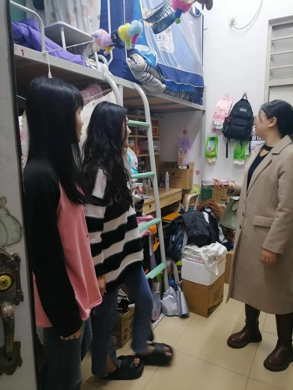 走访期间,两位老师提醒同学们要遵守校内的相关规定,养成良好的生活作息习惯,保持宿舍卫生干净整洁,对宿舍安全隐患进行了排查,特别强调宿舍用电安全,避免使用大功率电器,督促同学们爱护宿舍环境,妥善保管贵重物品,共同营造良好的生活学习氛围。