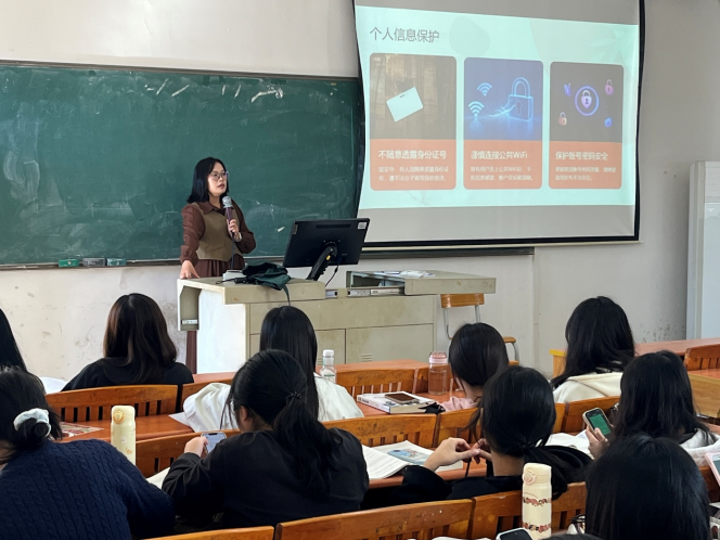 班会首先聚焦消防安全、网络安全与反诈的宣传,构建全方位风险防范体系。围绕全国消防日,介绍灭火器“提拔握压”用法,明确火灾报警要点,重申宿舍消防铁律,强化疏散逃生技巧。随后结合真实案例强调学生的个人信息与账号安全的重要性,让学生了解高发诈骗的套路,普及防诈技巧,明确受骗后报警、留证、冻账户的处理流程。