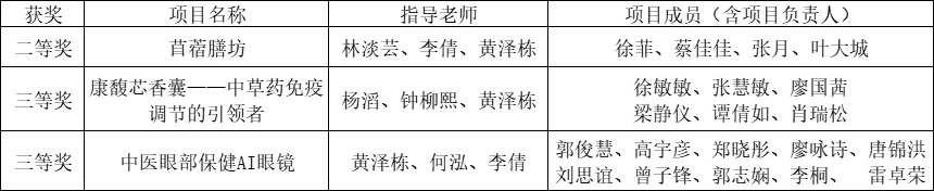 本次比赛健康医学院共推荐18支队伍参赛,经过校级专家评审层层筛选后,健康医学院的3个项目团队晋级校级决赛路演。路演现场,各位项目主讲人充分向各位评审阐述了项目的具体内容,最终我院获得1个“二等奖”:苜蓿膳坊;获得2个“三等奖”,分别是:康馥芯香囊——中草药免疫调节的引领者、中医眼部保健AI眼镜。具体项目成员名单如下:
