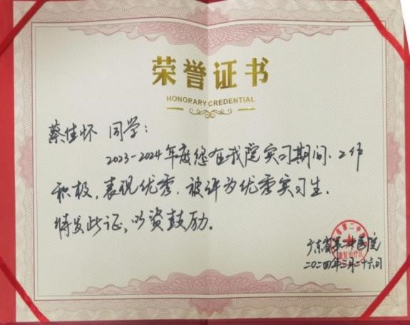 作为21级康复班在广东省第二中医院总院的学生组长,他以饱满热情、扎实作风,出色完成实习任务,获患者家属感谢信及科室主任表扬。蔡佳怀作为临时党小组组长,带领团队开展学习、献血等活动,累计献血7000ml,展现党员模范作用。实习中,他们积极协助管理、服务患者,获家属认可,并荣获篮球赛冠军,展现团队协作精神。