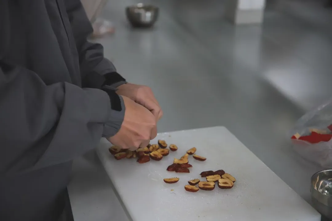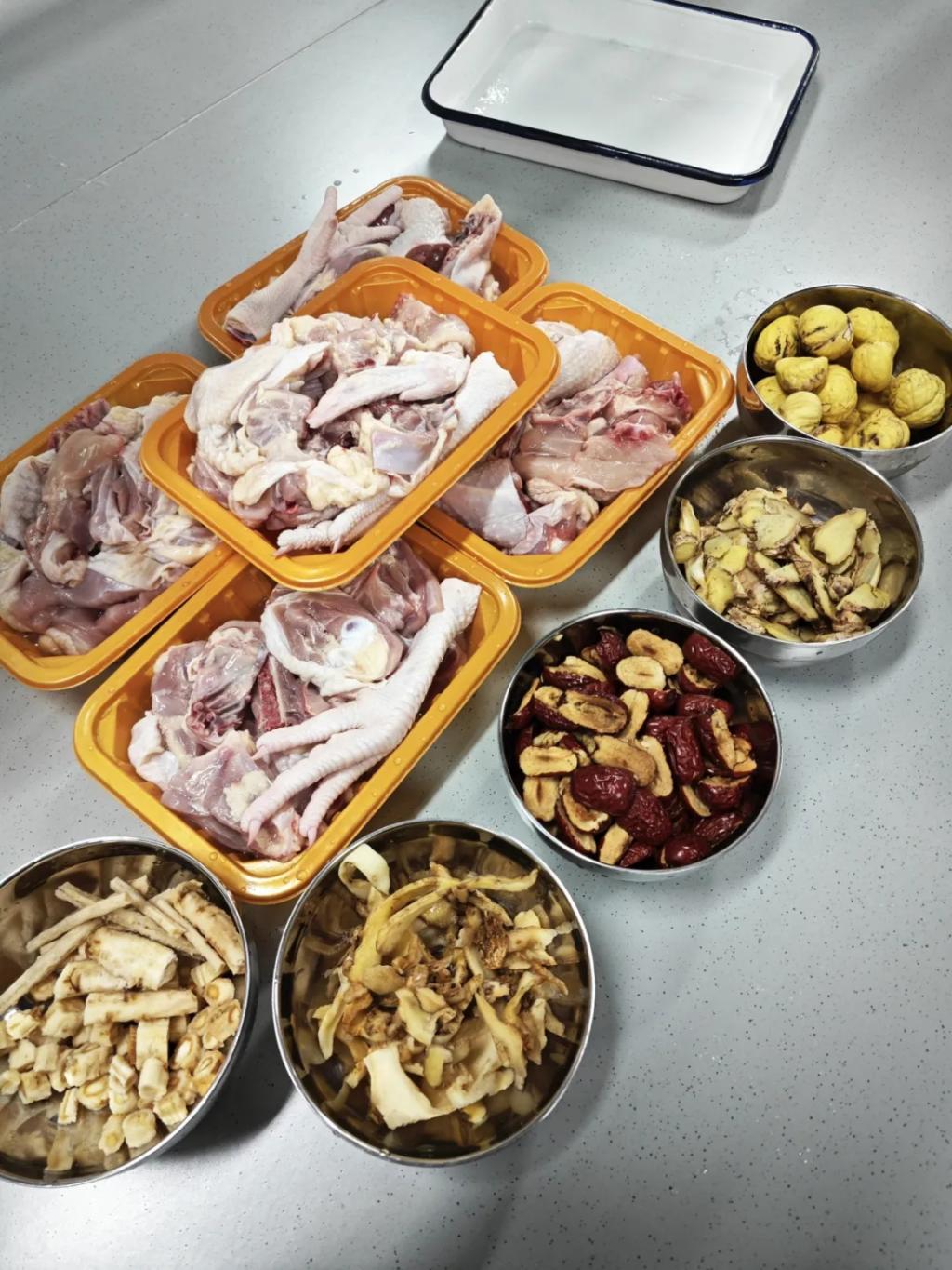 本次活动成员分成了四个小组:器材组、食材组、煲汤组和打包组。器材组成员负责清洗锅、刀、铁盘等器材。食材组成员负责将沙参、玉竹、栗子肉、红枣洗净备好。煲汤组成员负责将鸡肉切块焯水,锅中加适量清水,放入鸡肉、沙参、玉竹、栗子肉、红枣及姜片。大火煮开后转小火慢炖约1.5小时,至鸡肉熟烂、栗子软糯。期间适时搅拌,使食材均匀受热,让沙参与玉竹的药效充分融入汤中。炖煮完成后,依个人口味加盐调味。打包组成员负责分批次将新鲜出炉的鸡汤装入饭盒中。
