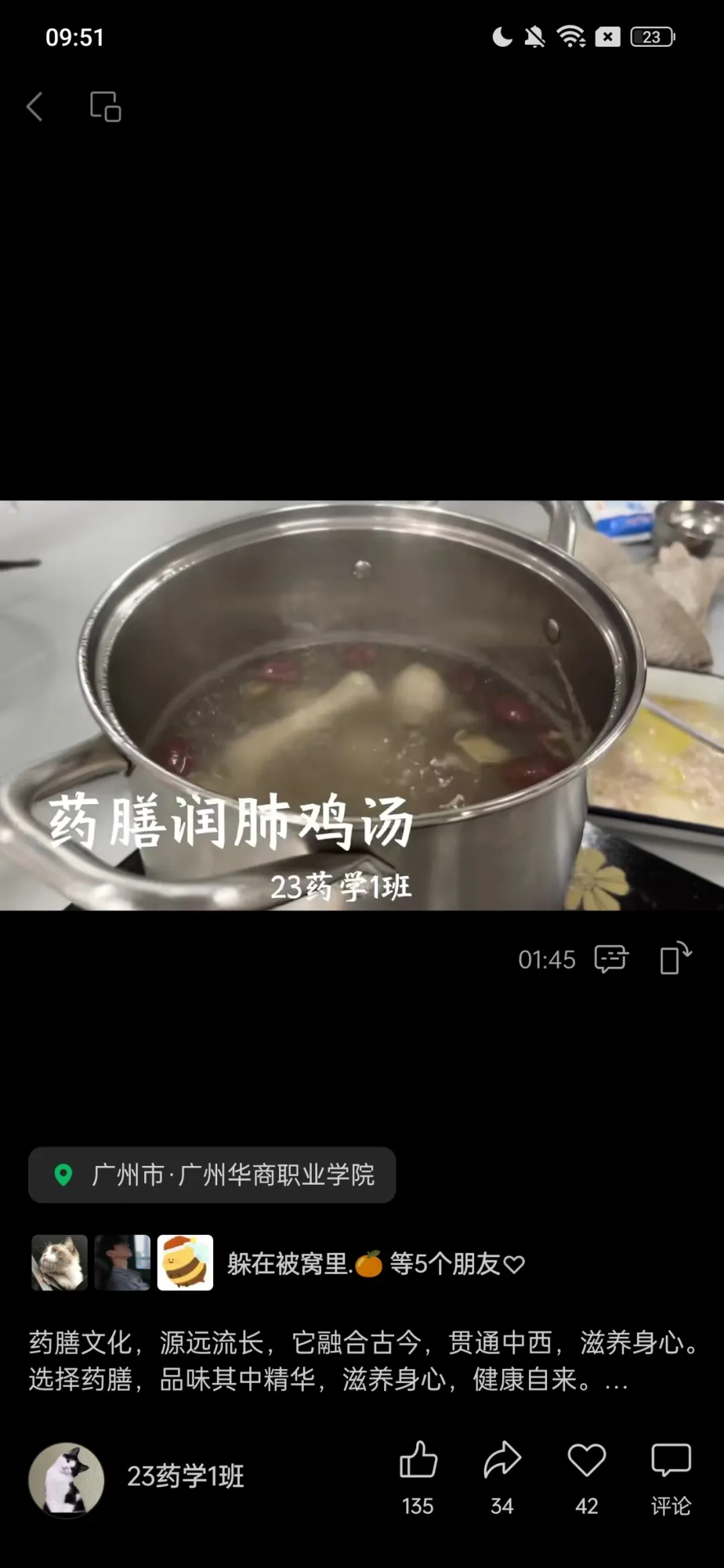 寒冬时节,温情涌动,一场别具意义的活动落下帷幕。活动过程中,班级凝聚力不断提升,我班同学更是用心回顾活动的点滴过程,精心制作了一则关于润肺鸡汤的讲解视频,旨在通过这一视频,将药膳养生知识传递给更多的人,让大家都能感受到这份独特的温暖与健康关怀。此次活动视频的分享量为34,点赞量共为177。