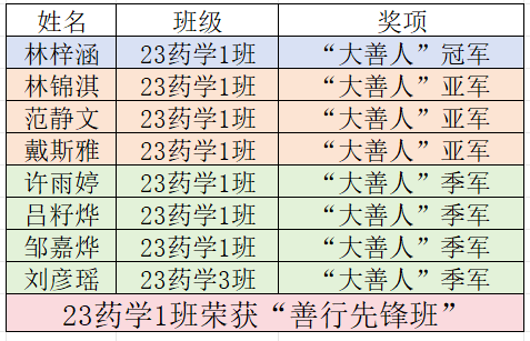 活动初期,23药学1班班委团召开专项会议,结合辅导员杨敏娟老师的提议,精心设计了“善行接龙”活动,规则如下:个人每日在小程序中上传“善行照片或视频加文字描述”,可选择拾金不昧、整理实验室和社区志愿服务等形式,分为大、中、小善行程度进行积分排名。班级根据4月1日至4月30日总积分进行最终排名。