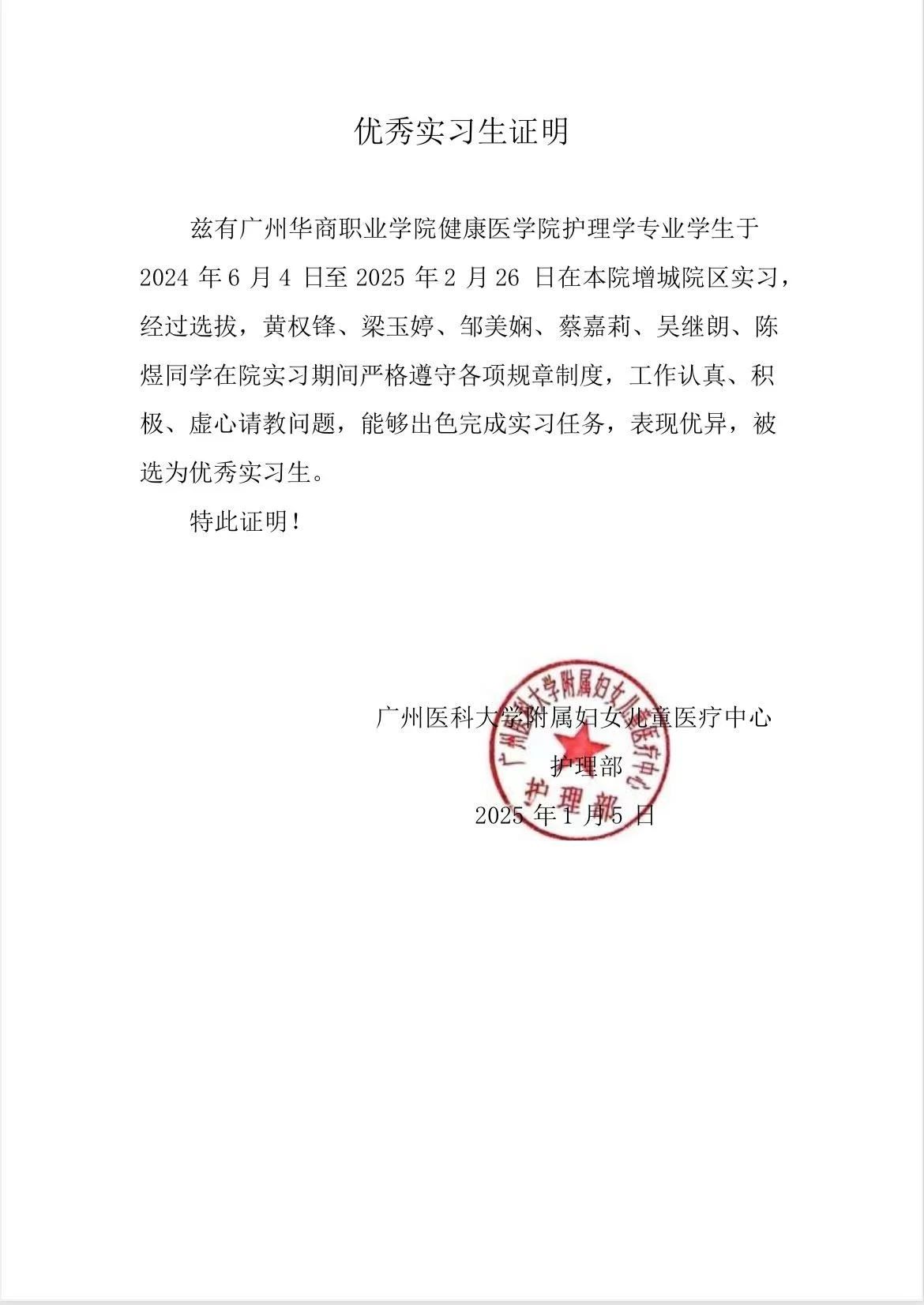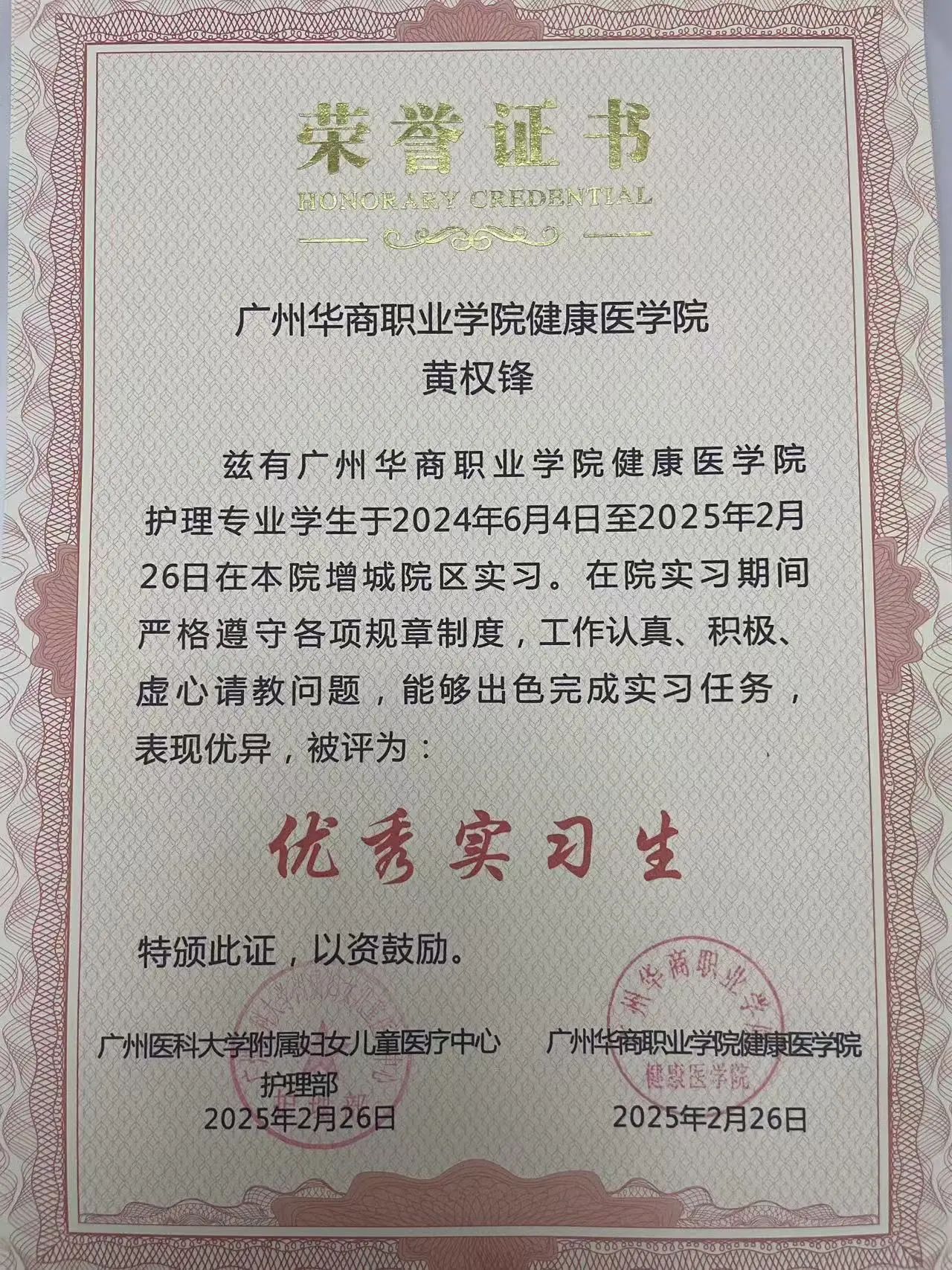 在广州市妇女儿童医疗中心增城院区实习期间,我以高度的责任心和专业素养践行护理使命。严格遵守医院规章制度,主动学习临床技能,虚心向带教老师请教,快速成长为科室得力助手。在儿科护理岗位上,细致观察患儿病情变化,耐心安抚家属情绪,多次获得患者及科室表扬,在此期间被医院评为“优秀实习生”。