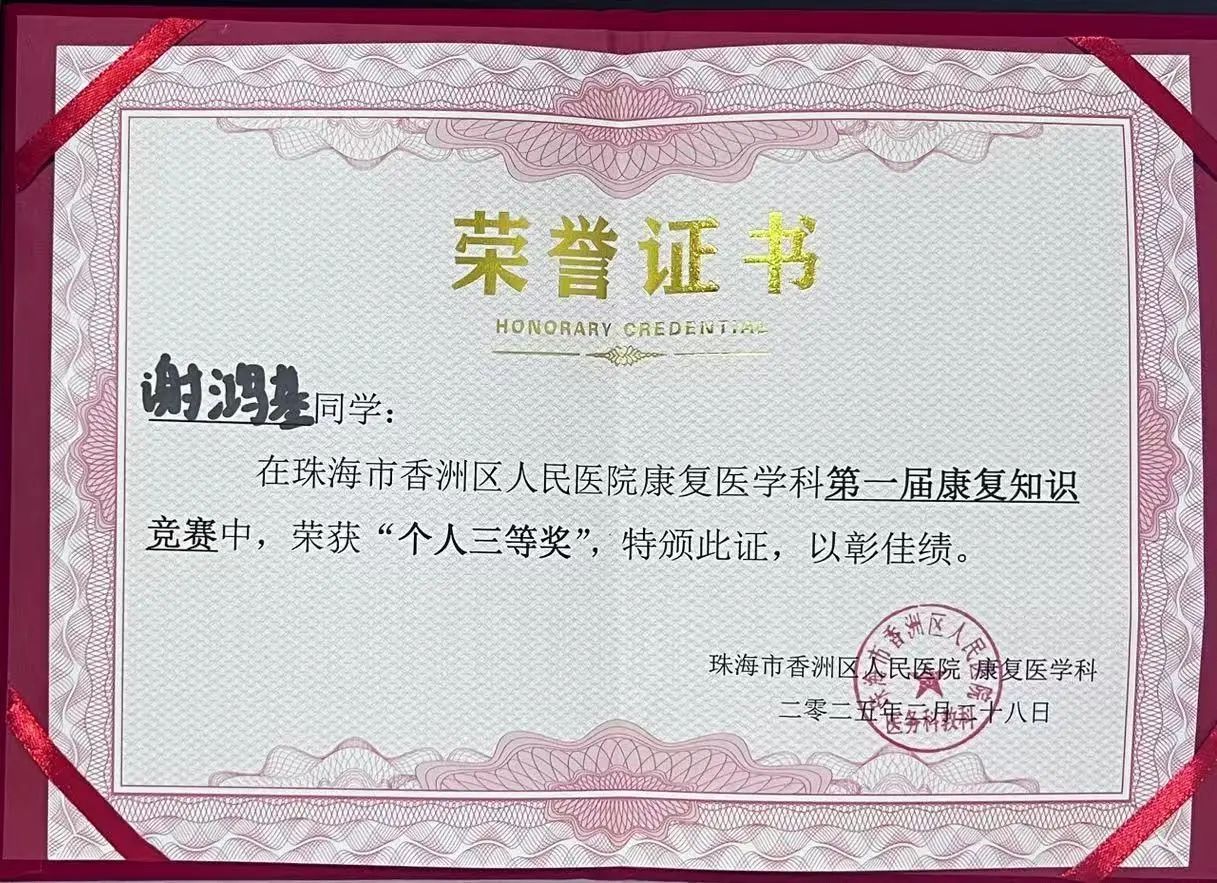在珠海市香洲区人民医院康复医学科举办的康复知识竞赛中,我荣获“个人三等奖”,深感荣幸。