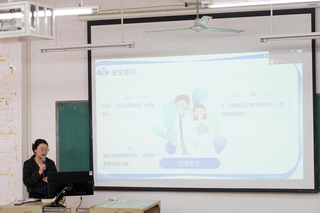 李康容老师和何泓老师强调了实习安全,不管是直接外出实习还是备考专插本,都要时时刻刻注意安全,包括财产安全、人身安全、交通安全。同时,还温馨提醒大家密切关注补考通知,确保实习与补考两不误,顺利毕业。她们鼓励学生与同事、上司和谐相处,构建良好人际关系。针对租房诈骗,她特别提醒学生提高警惕,确保租房过程安全,保障实习顺利进行。