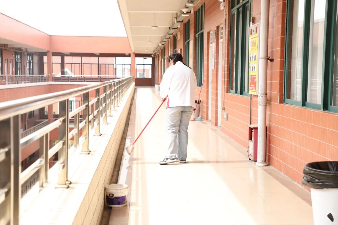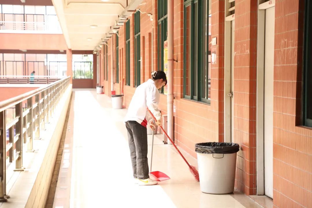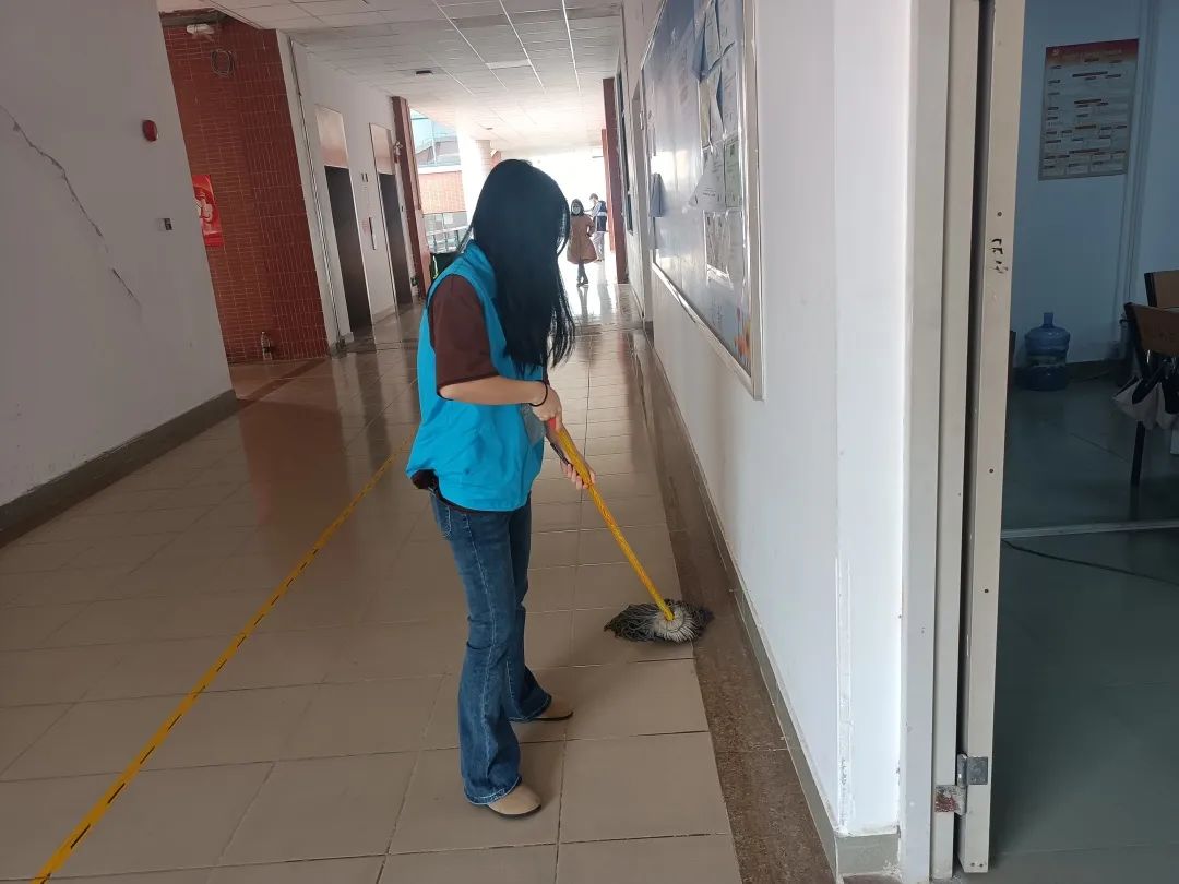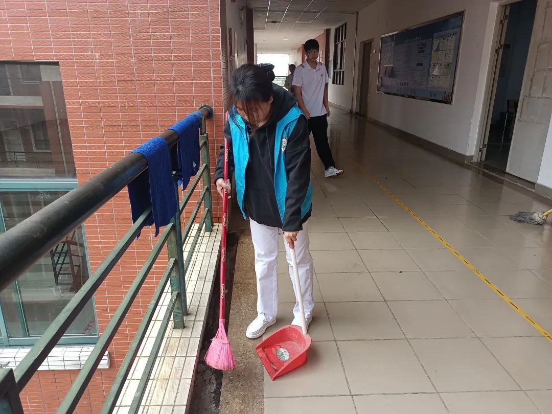 同学们准时到达教室,各个志愿者分工明确,认真的打扫每个角落。