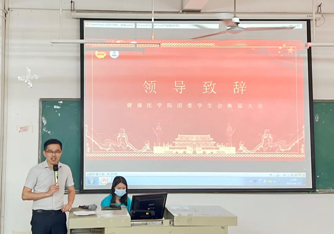 大会开始,莅临本次换届大会的领导与嘉宾:健康医学院党总支副书记黄泽栋老师、健康医学院院长助理叶雪兰老师、学生第一党支部书记、团委书记何泓老师、学生第二党支部书记赵巧鸿老师、团委副书记梁杨清老师、健康医学院辅导员李倩老师、杨晓蕾老师、行政秘书邱玟钿老师、教务秘书蒋翠玲老师、实习辅导员冯华昌老师、林晓颖老师。