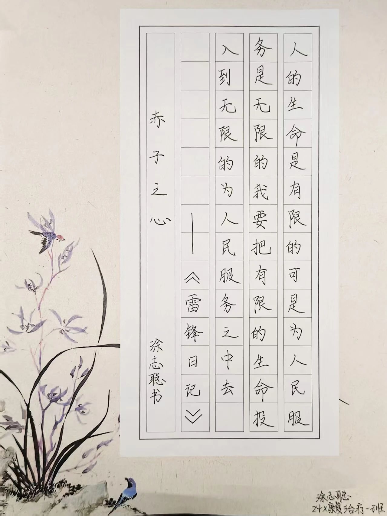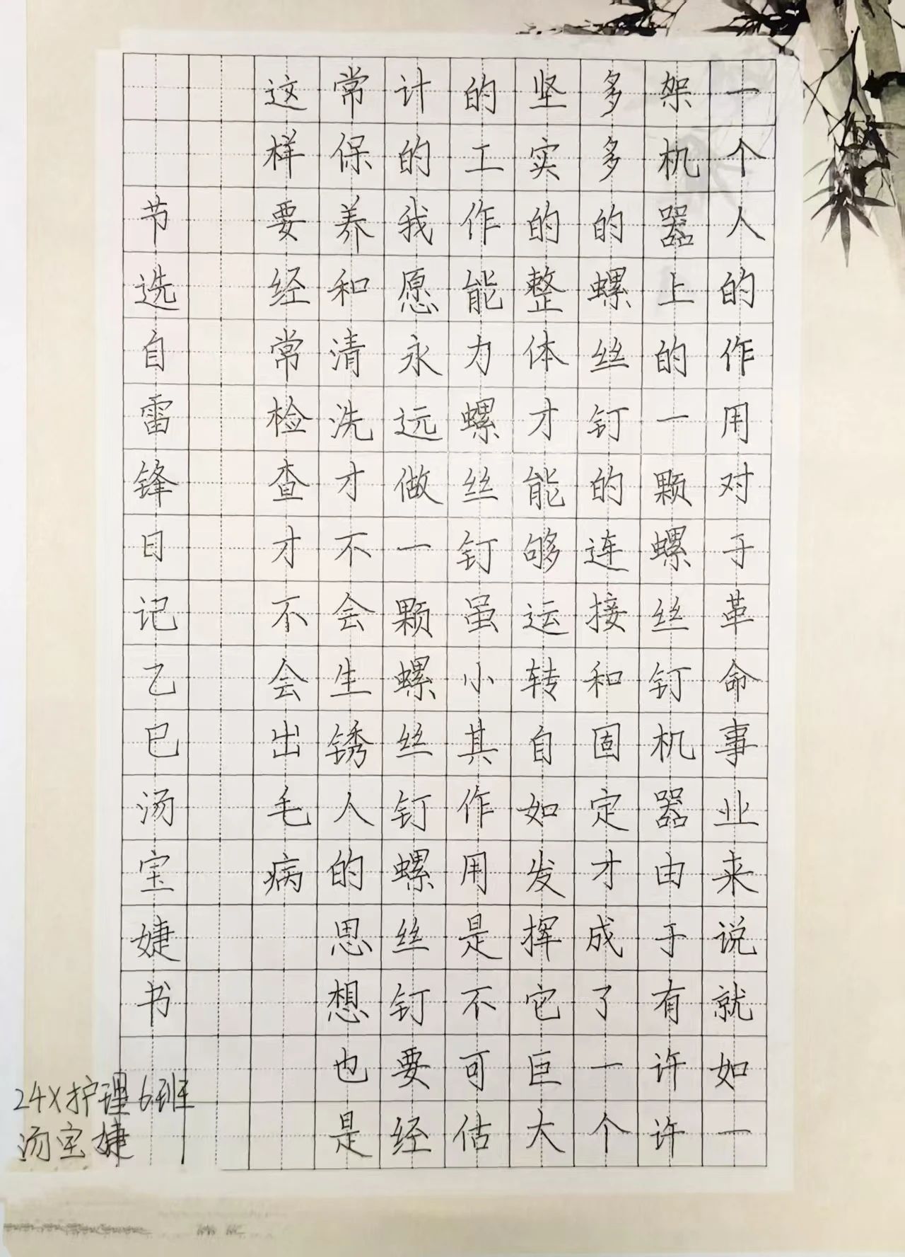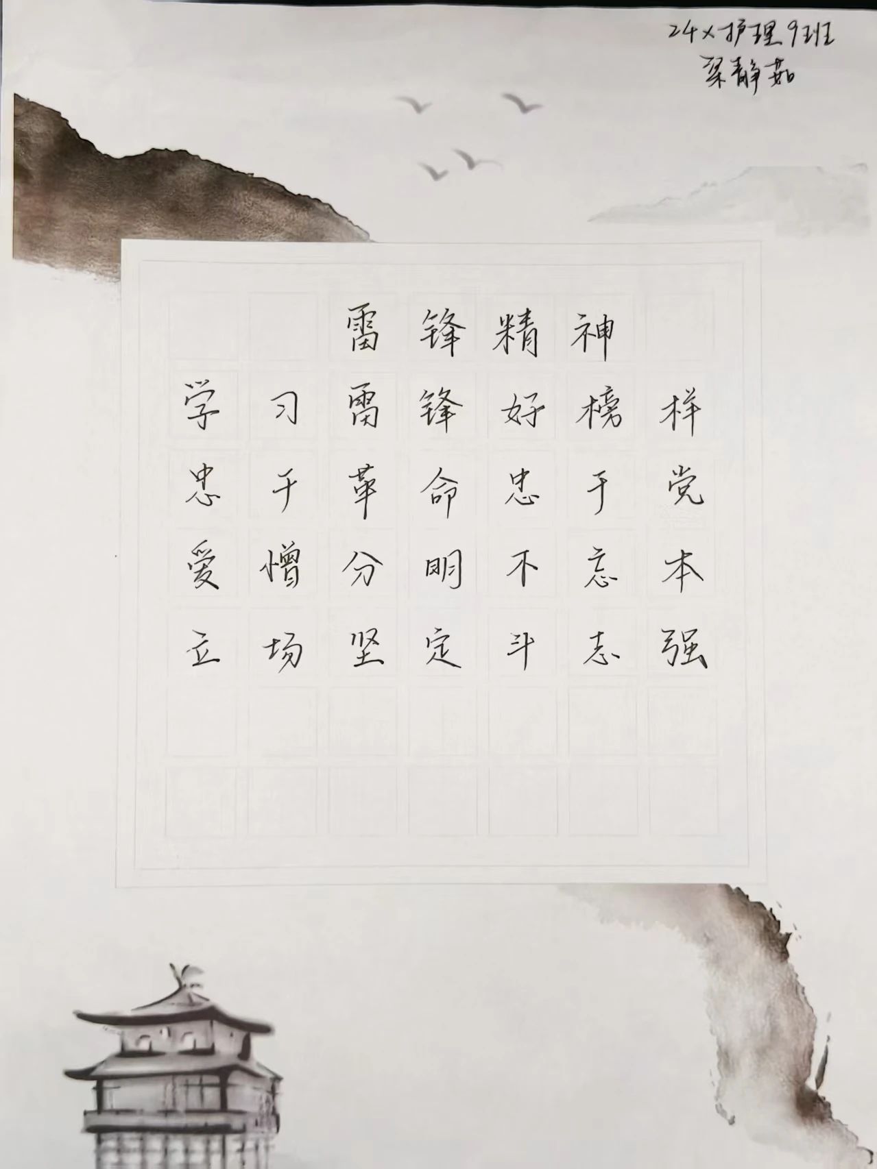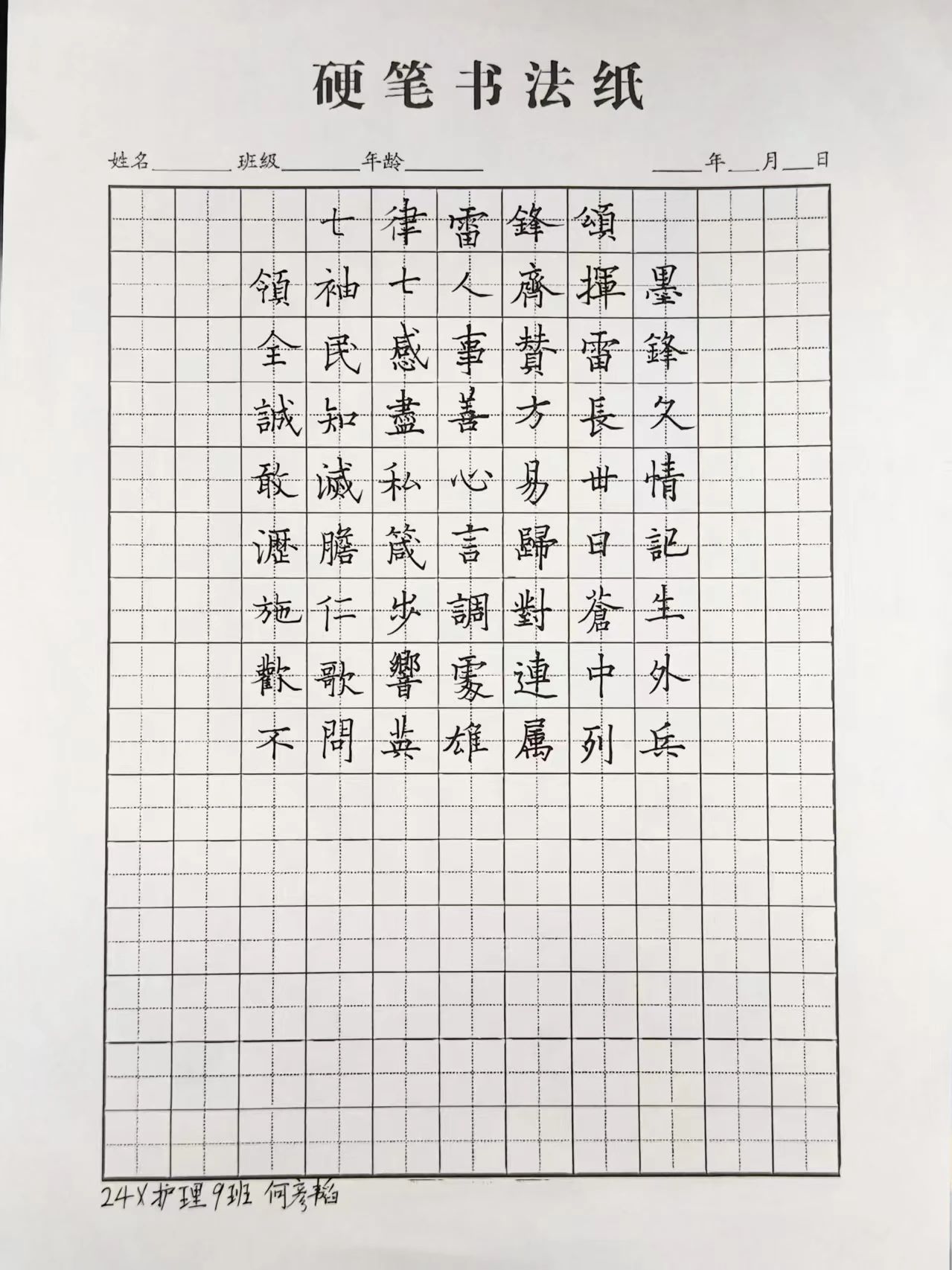 本次活动同学们踊跃参与,利用课余时间精心创作硬笔书法作品,用手中的笔认真书写,将对雷锋精神的敬仰融入一笔一划之中。经过3月22日至3月26日的作品前期征集,主办方在后期评比中从116份作品中选出了9份优秀作品,分别是: