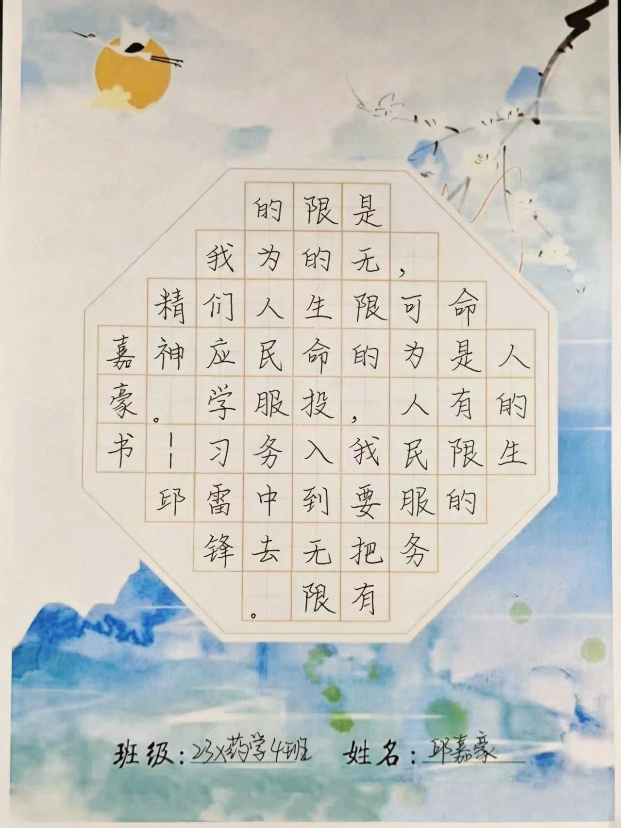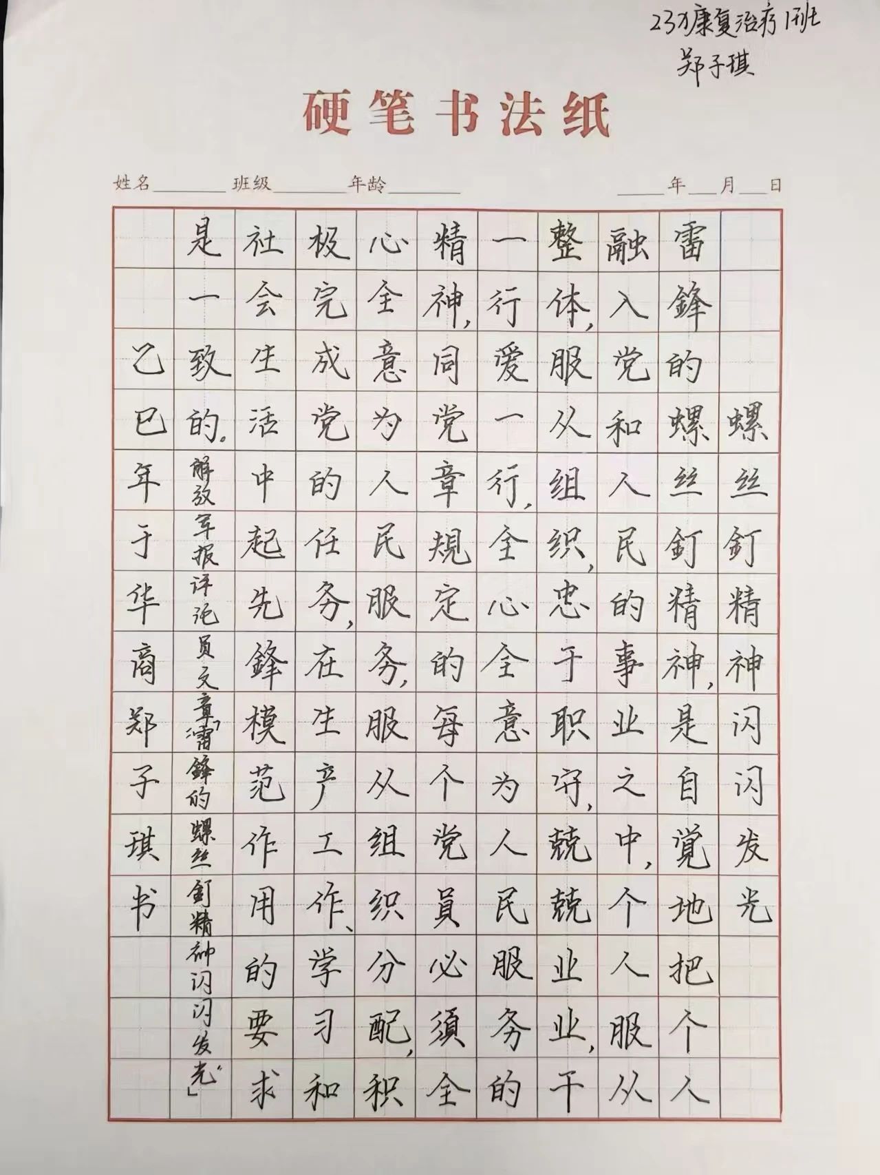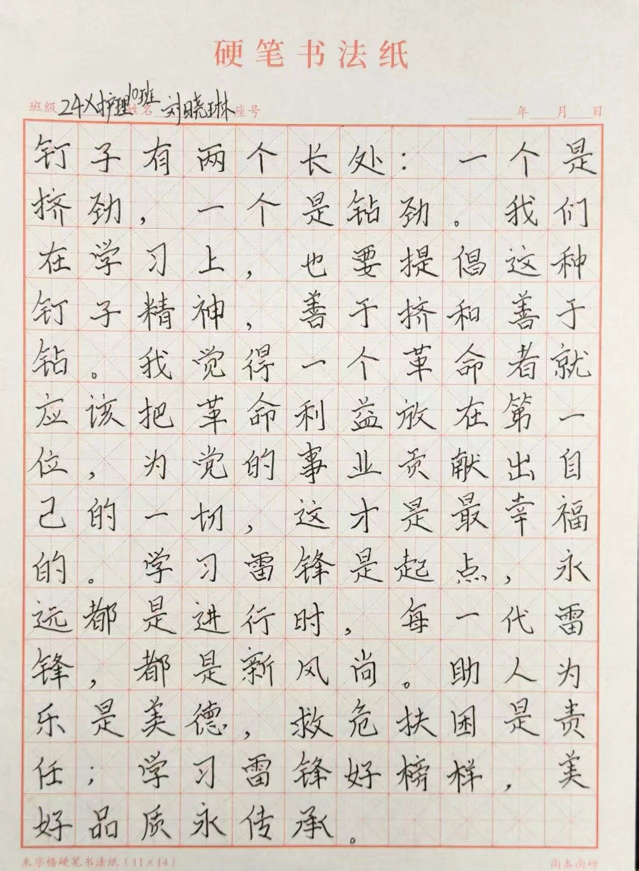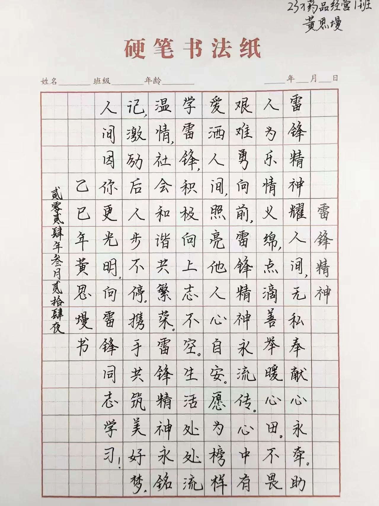 此次硬笔书法活动不仅为同学们提供了一个展示书法技艺的平台,更让雷锋精神在校园中得以传承和弘扬。通过书写的方式,雷锋精神深深烙印在同学们心中,激励着他们在今后的学习和生活中践行雷锋精神,做新时代的有为青年。同时,活动也营造了积极向上、健康文明的校园文化氛围,增强了集体凝聚力,为构建和谐校园增添了一抹亮色。