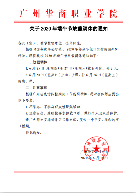 上一条:广州华商职业学院关于2020年国庆节及中秋节放假调休安排的通知