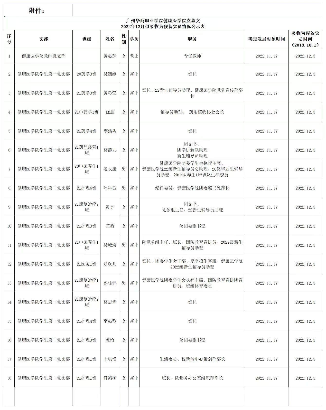 根据《中国共产党发展党员细则》、《广州华商职业学院发展党员工作实施办法》等相关文件要求,经党组织培养、教育和考察并广泛征求群众意见,经支部委员会审查和研究,支部党员大会讨论表决,报学院党总支审核,拟吸收黄惠珠等18名同志为中共预备党员(具体名单见附件)。现将有关情况予以公示。