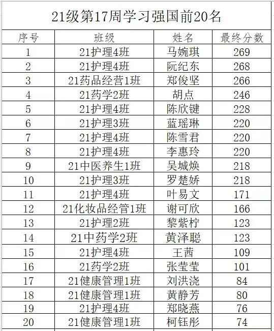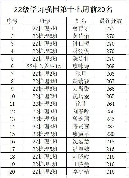 为推动学习贯彻习近平新时代中国特色社会主义思想主题教育走深走实。并让同学们增强党的教育,充分利用好“学习强国”优质网络学习平台,在支部内形成“比、学、赶、超”的良好学习氛围,现奖我院各级学生第十七周的学习强国前二十名学生的积分作如下公示: