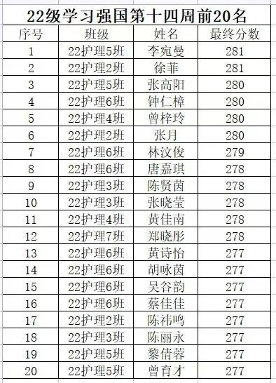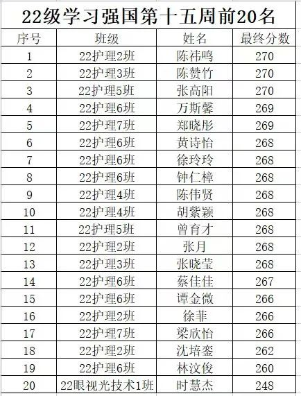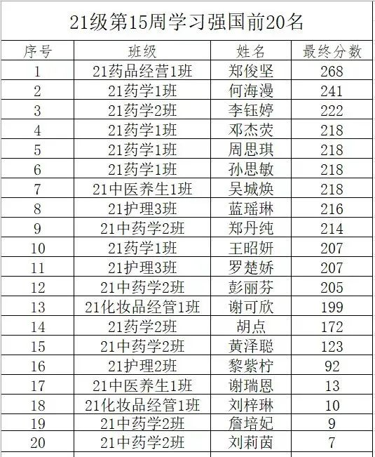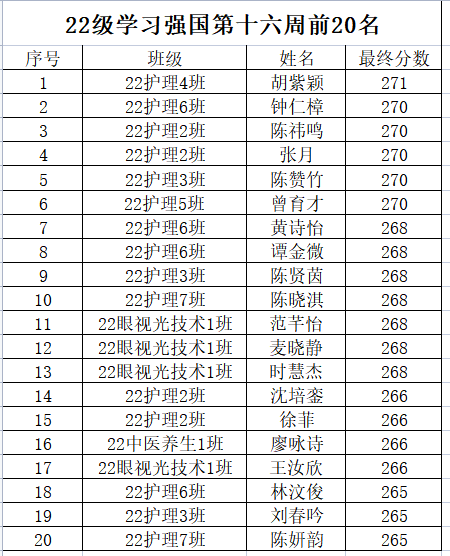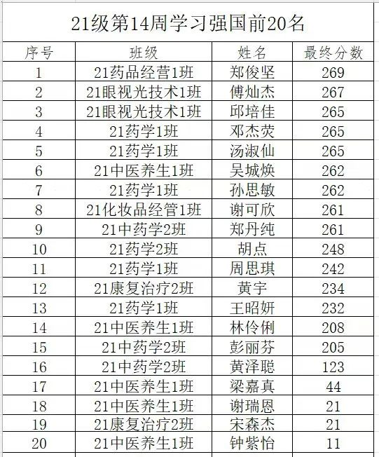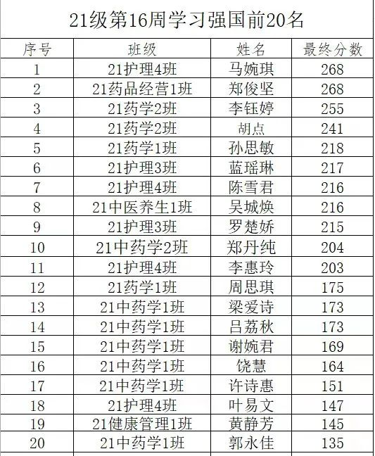 为推动学习贯彻习近平新时代中国特色社会主义思想主题教育走深走实,持之以恒加强党的创新理论武装,为全面建设社会主义现代化带动学生形成大学习氛围。现将健康医学院各级学生第十四、十五、十六周的学习强国前二十名学生的积分作如下公示: