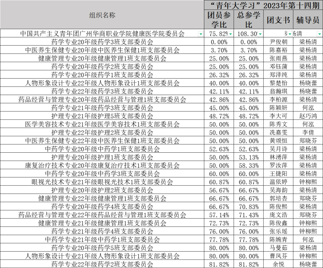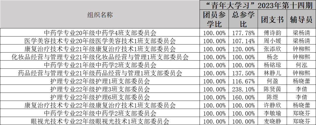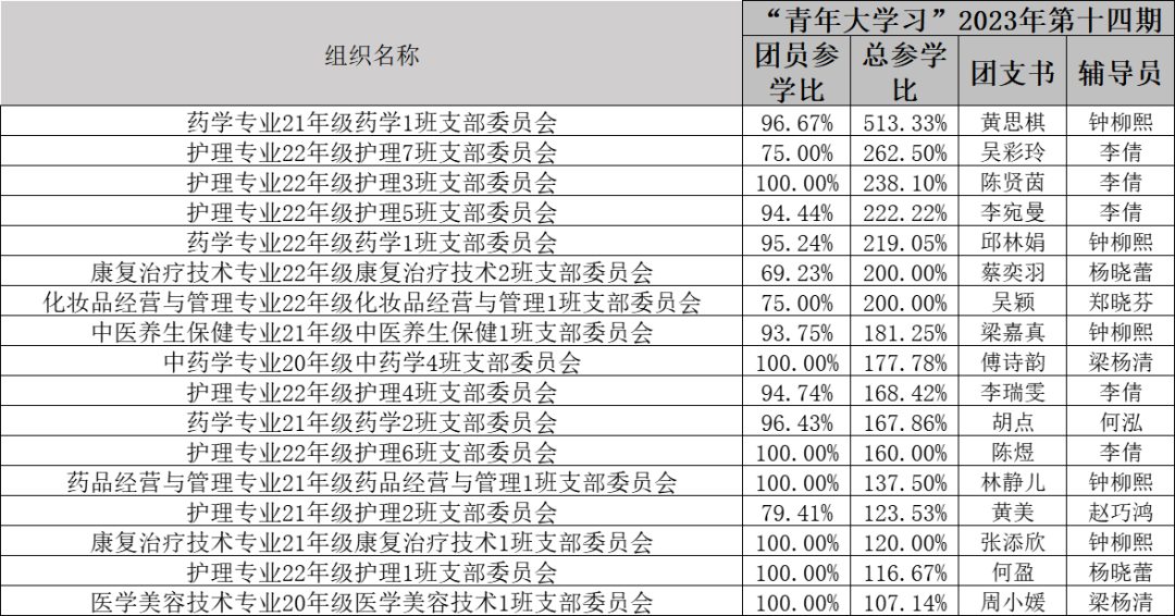 以上班级在2023年第14期的“青年大学习”中班级总参学率超过了100%,真棒,为你们点赞!请继续保持!