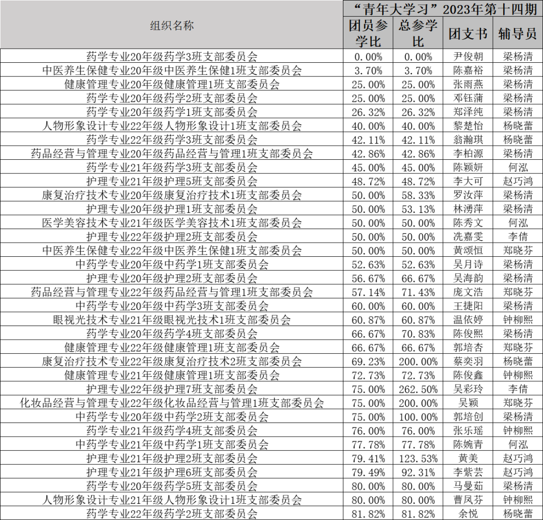 以上班级在2023年第14期的“青年大学习”的团员参学率较低,请积极动员广大团员开展青年大学习,要加油哦!