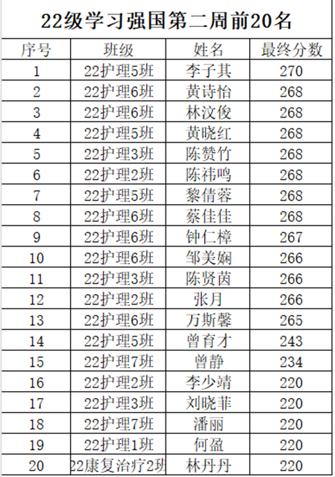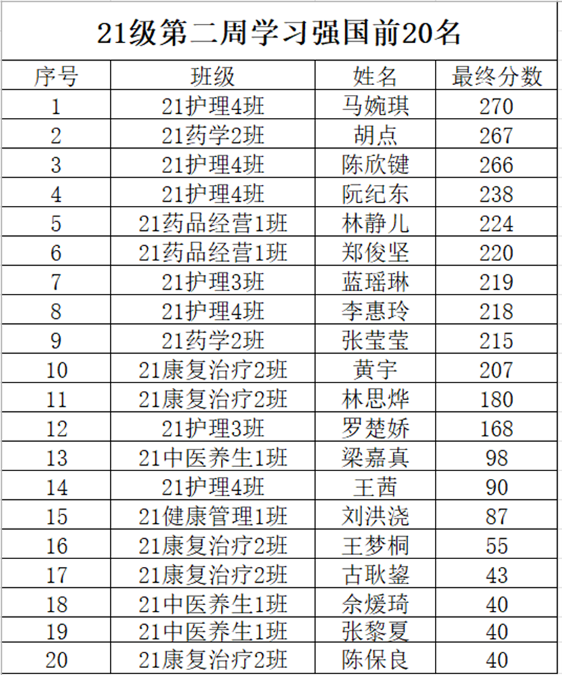 健康医学院党支部为进一步增强党的意识且做好“学习强国”学习平台的推广使用工作,激发学生学习积极性和主动性,营造“比学赶超”的浓厚学习氛围,现将我院各级学生第二周的学习强国前二十名学生的积分作如下公示: