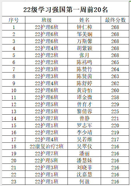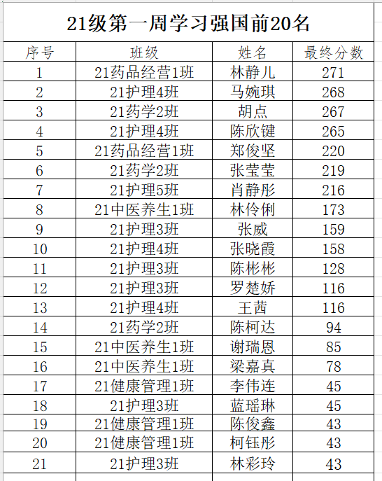 为了全面系统深入学习习近平新时代中国特色社会主义思想, 持之以恒加强党的创新理论武装,为全面建设社会主义现代化带动学生形成大学习氛围。现将健康医学院各级学生第一周的学习强国前二十名学生的积分作如下公示: