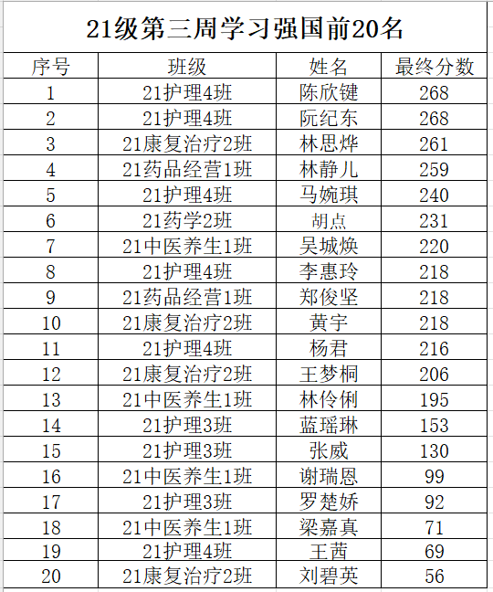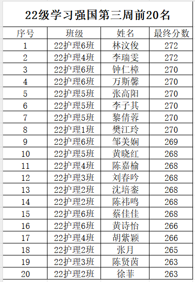 为了全面系统深入学习习近平新时代中国特色社会主义思想,持之以恒加强党的创新理论武装,进一步推进“学习强国”学习平台的覆盖使用,在全院范围内形成浓厚的学习氛围推动政治理论学习态度化长效化,现将我院各级学生第三周的学习强国前二十名学生的积分作如下公示: