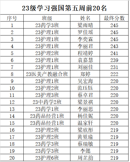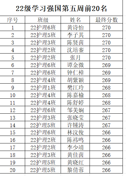 为了全面系统深入学习习近平新时代中国特色社会主义思想,持之以恒加强党的创新理论武装,进一步推进“学习强国”学习平台的覆盖使用,在全院范围内形成浓厚的学习氛围推动政治理论学习态度化长效化,现奖我院各级学生第五周的学习强国前二十名学生的积分作如下公示: