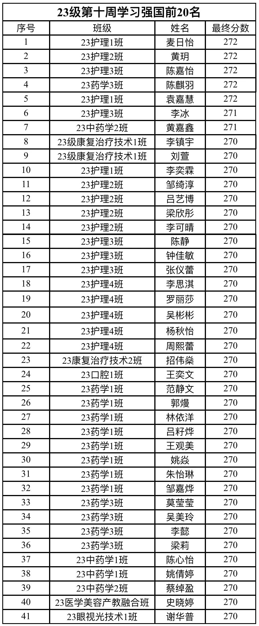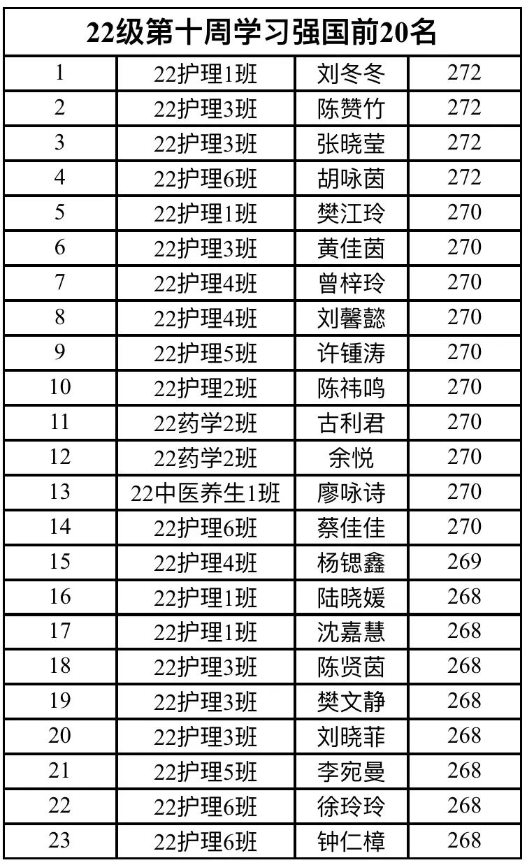 为推动学习贯彻习近平新时代中国特色社会主义思想主题教育走深走实。并让同学们增强党的教育,充分利用好“学习强国”优质网络学习平台,在支部内形成“比、学、赶、超”的良好学习氛围,现将我院各级学生第十周的学习强国前二十名学生的积分作如下公示。