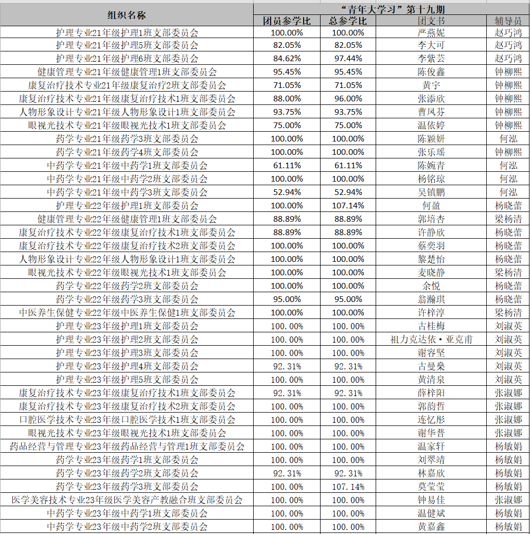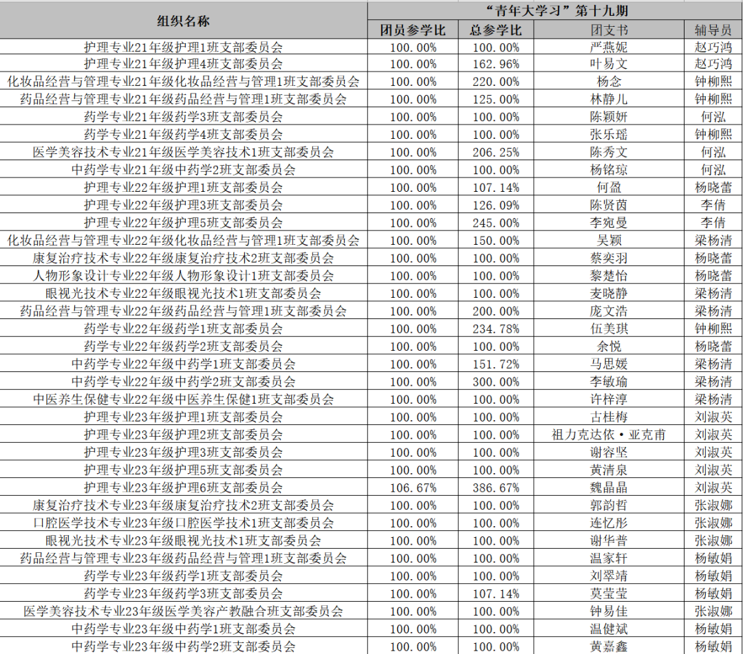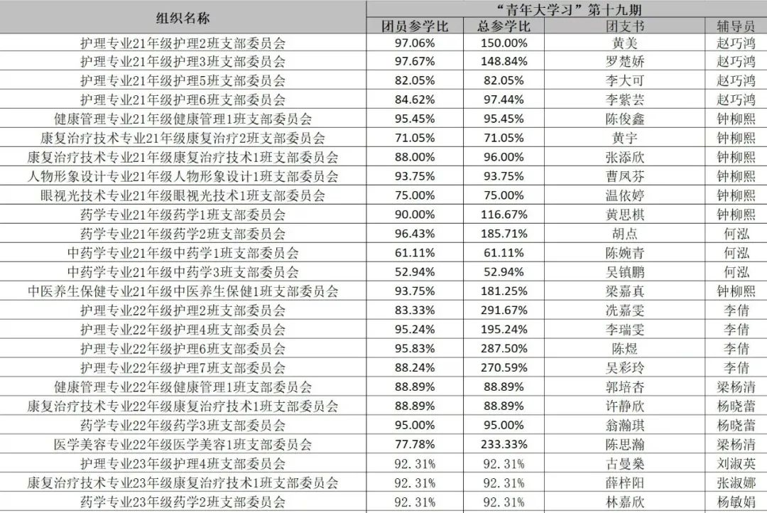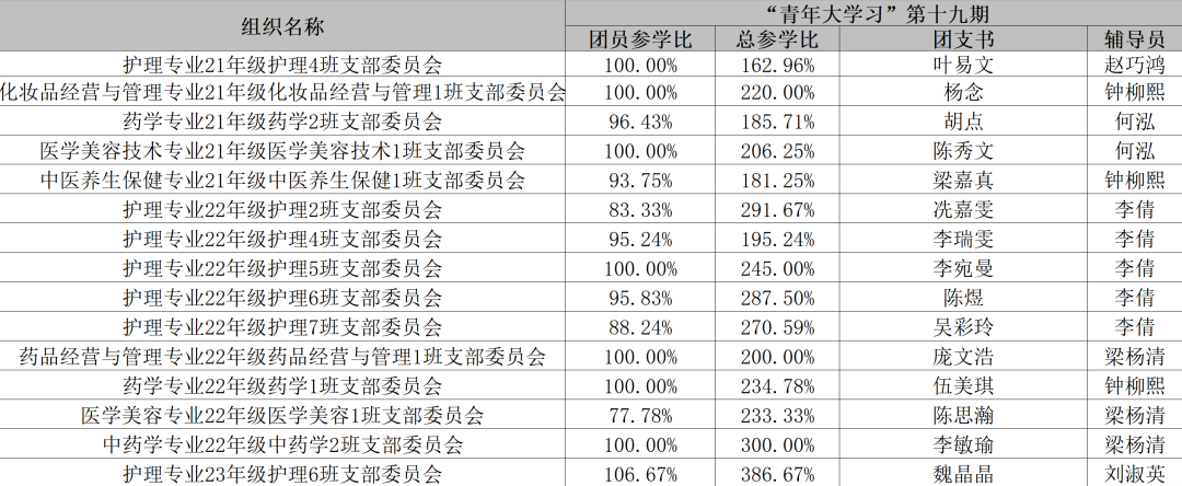 以上班级在2023年第19期的“青年大学习”中班级总参学率超过了160%,真棒,为你们点赞!请继续保持!
