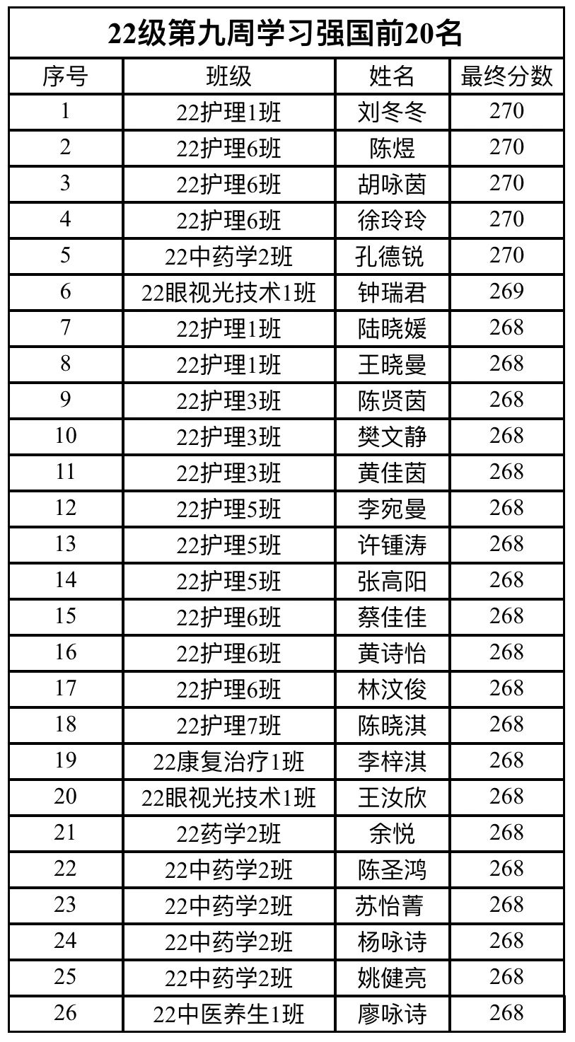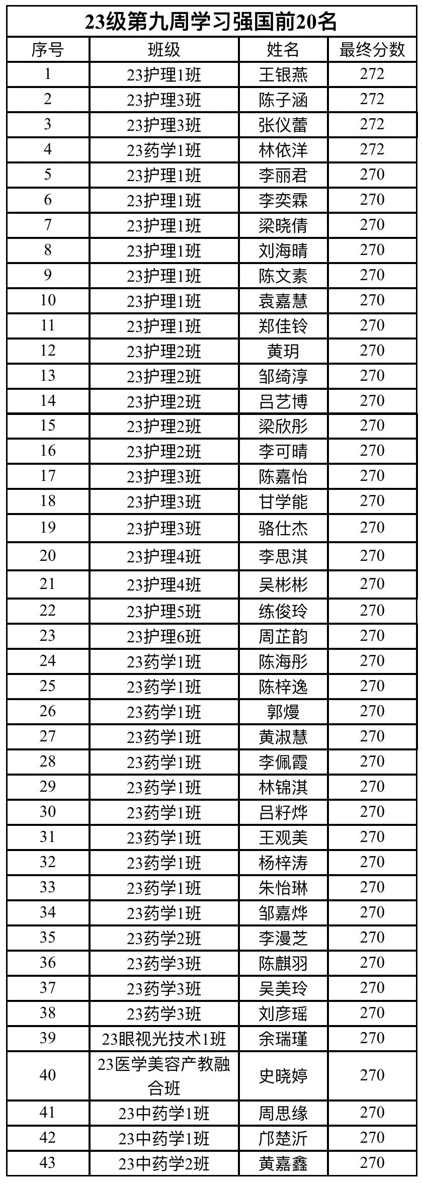 为推动学习贯彻习近平新时代中国特色社会主义思想主题教育走深走实。并让同学们增强党的教育,充分利用好“学习强国”优质网络学习平台,在支部内形成“比、学、赶、超”的良好学习氛围,现奖我院各级学生第九周的学习强国前二十名学生的积分作如下公示: